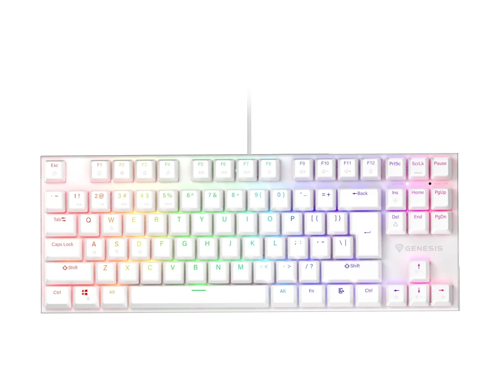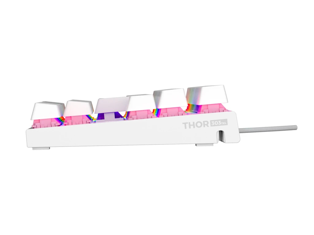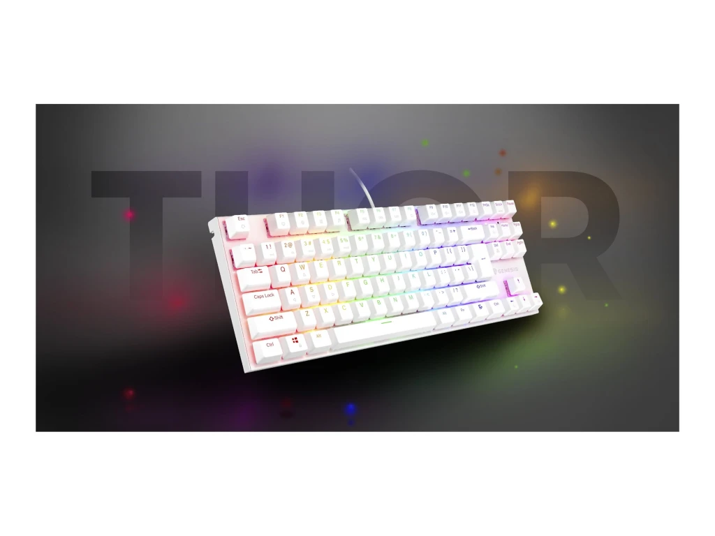 GENESIS Thor 303 TKL. Klaviatuuri kujutegur: Tenkeyless (80–87%) numbriteta. Klaviatuuri stiil: Sirge. Ühenduvustehnoloogia: Juhtmega ühendatud, Seadme liides: USB, Klaviatuuri klahvilüliti: Mehaaniline klahvlüliti, Klaviatuuri paigutus: QWERTY, Klaviatuuri klahvide arv: 87. Tagantvalgustuse tüüp: RGB LED. Kaabli pikkus: 1,8 m. Soovituslik kasutus: Mängimine. Toote värv: Valge