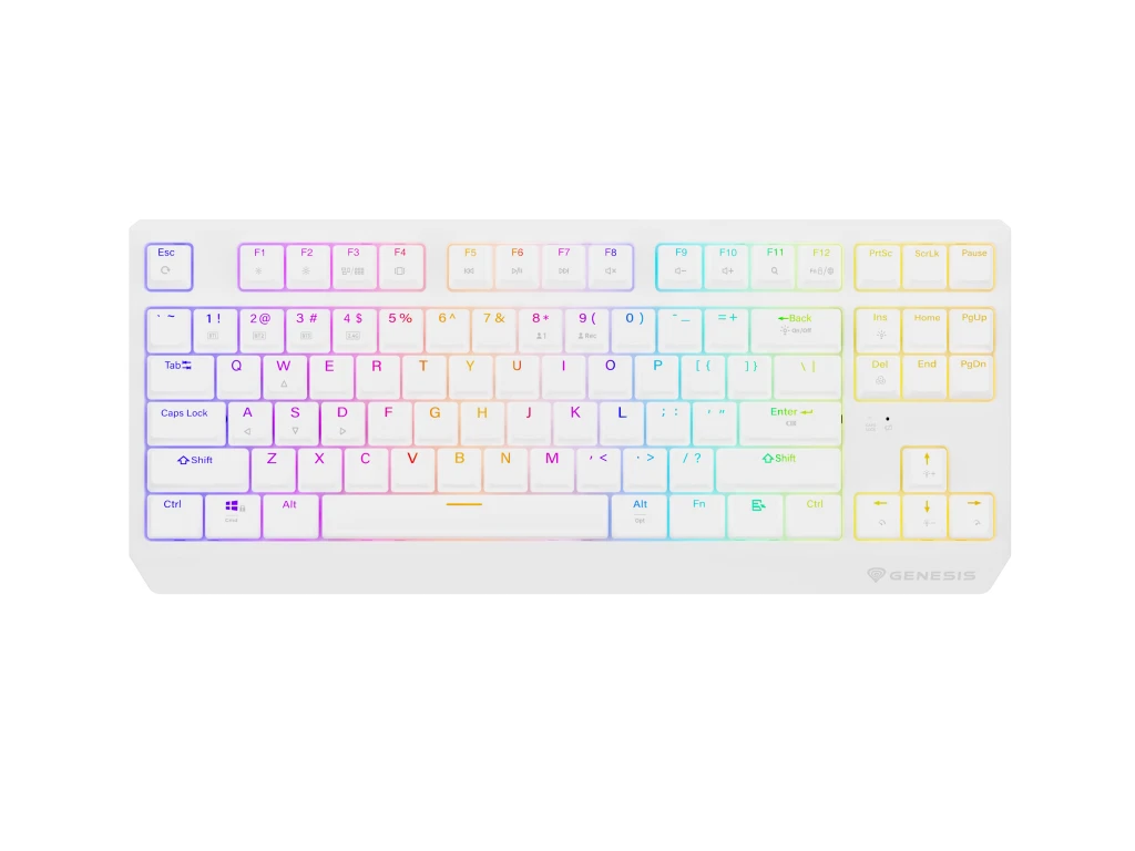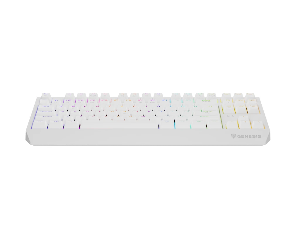 GENESIS Thor 230 TKL. Klaviatuuri kujutegur: Tenkeyless (80–87%) numbriteta. Klaviatuuri stiil: Sirge. Ühenduvustehnoloogia: Juhtmega ühendatud & juhtmevaba, Seadme liides: USB + RF Wireless + Bluetooth, Klaviatuuri klahvilüliti: Mehaaniline klahvlüliti, Klaviatuuri paigutus: QWERTY, Klaviatuuri klahvide arv: 87. Tagantvalgustuse tüüp: RGB LED. Kaabli pikkus: 1,6 m. Soovituslik kasutus: Mängimine. Toote värv: Valge