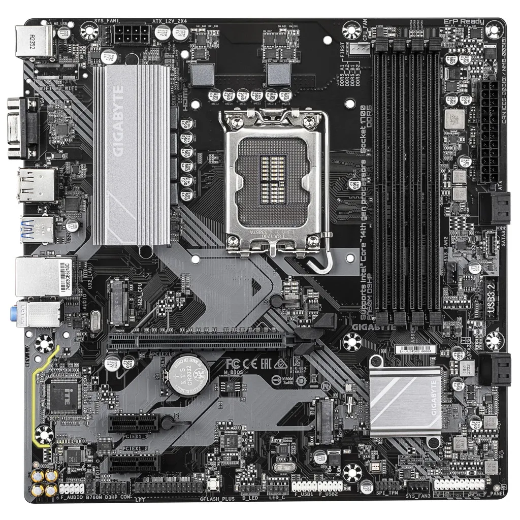GIGABYTE B760M D3HP. Protsessori tootja: Intel, Protsessori pesa: LGA 1700, Ühilduvad protsessoriseeriad: Intel® Celeron®, Intel® Core™ i3, Intel® Core™ i5, Intel® Core™ i7, Intel® Core™ i9,.... Toetatud mälutüübid: DDR5-SDRAM, Maksimaalne sisemälu: 256 GB, Mälupesa tüüp: DIMM. Kõvaketta ühenduse tüüp: M.2, SATA III, Toetatud ketaste tüübid: HDD & SSD, RAID-tasemed: 0, 1, 5, 10. Maksimaalne resolutsioon: 4096 x 2304 pikslit. USB-pistmiku tüüp: USB tüüp A
