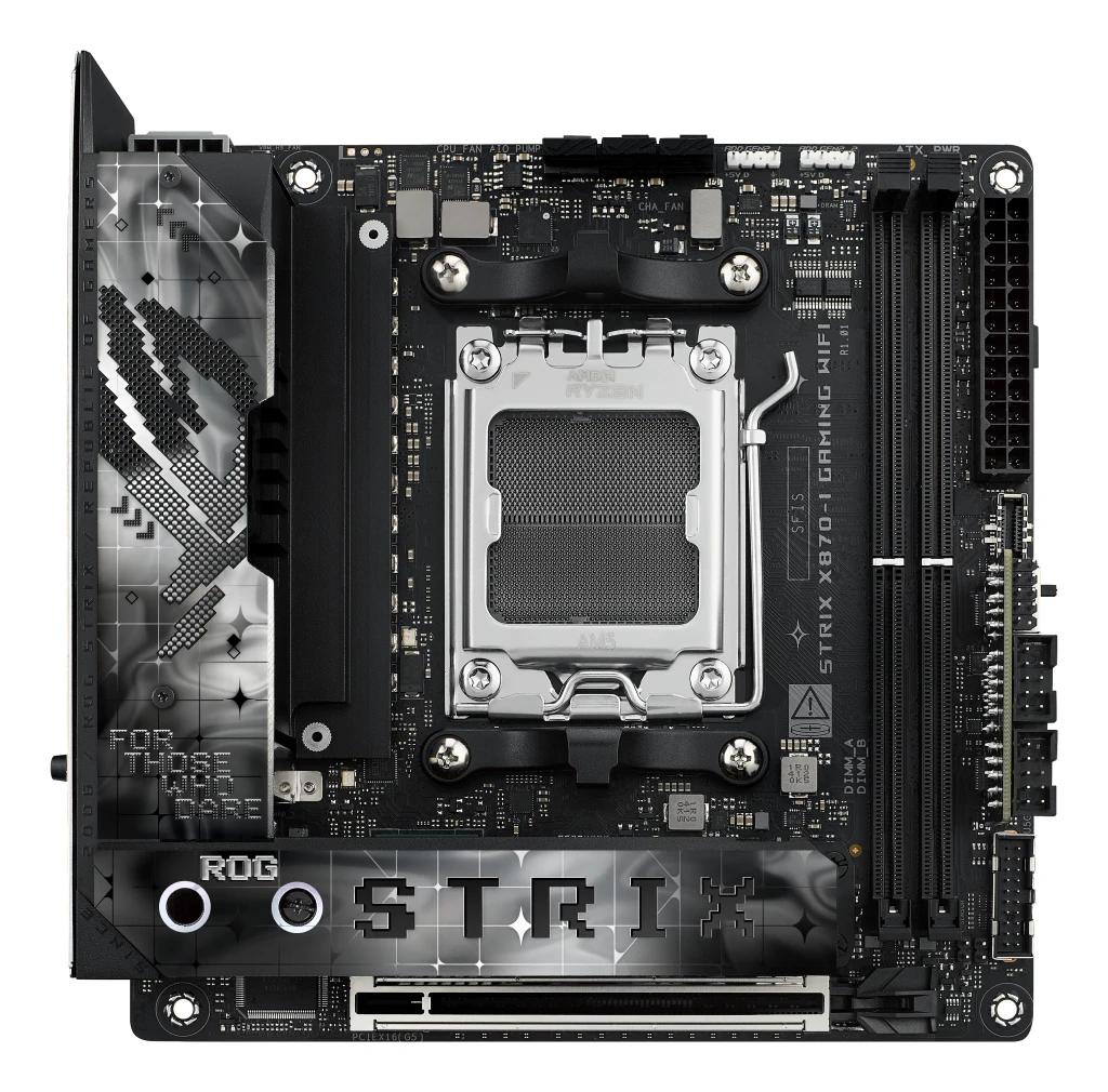 ASUS ROG STRIX X870-I GAMING WIFI. Protsessori tootja: AMD, Protsessori pesa: Protsessoripesa AM5, Ühilduvad protsessoriseeriad: AMD Ryzen 7000 Series, AMD Ryzen 8000 Series, AMD Ryzen 9000 Series. Toetatud mälutüübid: DDR5-SDRAM, Maksimaalne sisemälu: 96 GB, Mälupesa tüüp: DIMM. Kõvaketta ühenduse tüüp: M.2, SATA III, Toetatud ketaste tüübid: HDD & SSD, RAID-tasemed: 0, 1, 10. USB-pistmiku tüüp: USB tüüp A, USB tüüp-C. Ethernet-liidese tüüp: 2.5 Gigabit Ethernet, Kiire Ethernet, Gigabit Ethernet, Wi-Fi standard: Wi-Fi 7 (802.11be), WiFi-standardid: Wi-Fi 7 (802.11be)