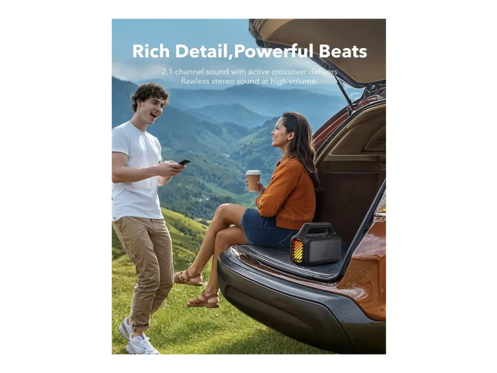 2.1 channel surround sound; PartyCast 2.0 technology for 100+ speakers pairing; Up to 24 hours of playtime; Built-in power bank; 7 unique preinstalled light effects; IPX7 waterproof and floatable