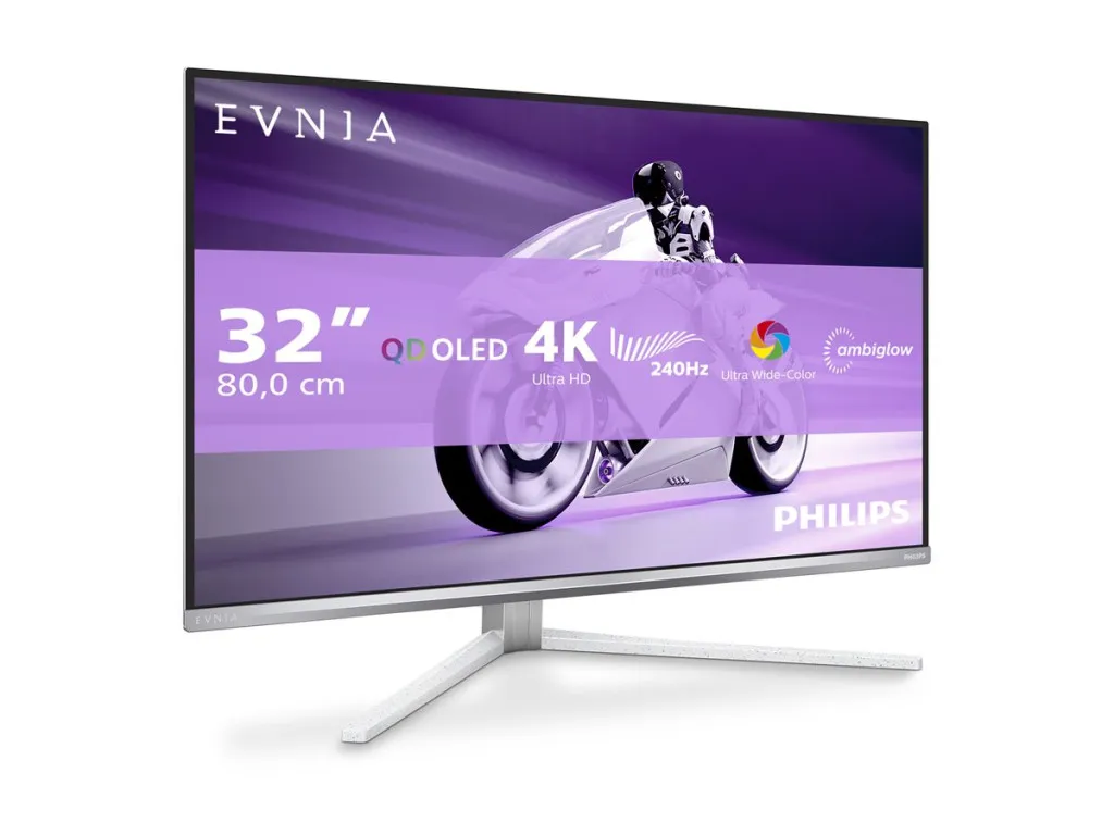 Philips Evnia 8000 32M2N8900/00. Ekraani diagonaal: 80 cm (31.5"), Ekraani resolutsioon: 3840 x 2160 pikslit, HD tüüp: 4K Ultra HD, Ekraani tehnoloogia: QD-OLED, Reaktsiooniaeg: 0,03 ms, Loomulik kuvasuhe: 16:9, Vaatenurk, horisontaalne: 178°, Vaatenurk, vertikaalne: 178°. Sisseehitatud kõlar(id). Sisseehitatud USB-jaotur, USB-jaoturi versioon: 3.2 Gen 1 (3.1 Gen 1). VESA paigaldamine, Kõrguse reguleerimine. Toote värv: Valge