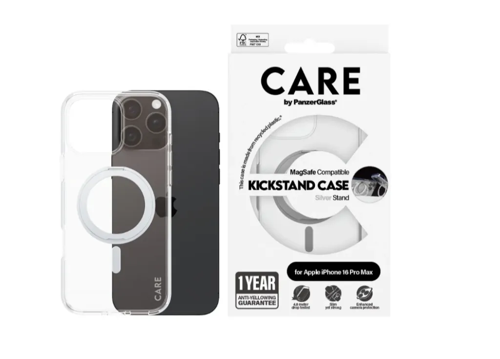 PanzerGlass CARE™ by ® Case Transparent w. Silver Kickstand & MagSafe iPhone 16 Pro Max. Karbi tüüp: Kate, Brändiühilduvus: Apple, Ühilduvus: Apple - iPhone 16 Pro Max, Toote värv: Läbipaistev