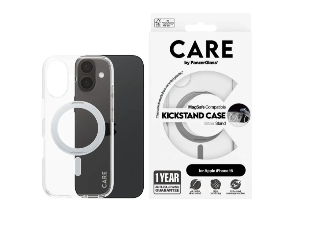 PanzerGlass CARE™ by ® Case Transparent w. Silver Kickstand & MagSafe iPhone 16. Karbi tüüp: Kate, Brändiühilduvus: Apple, Ühilduvus: Apple - iPhone 16, Toote värv: Läbipaistev