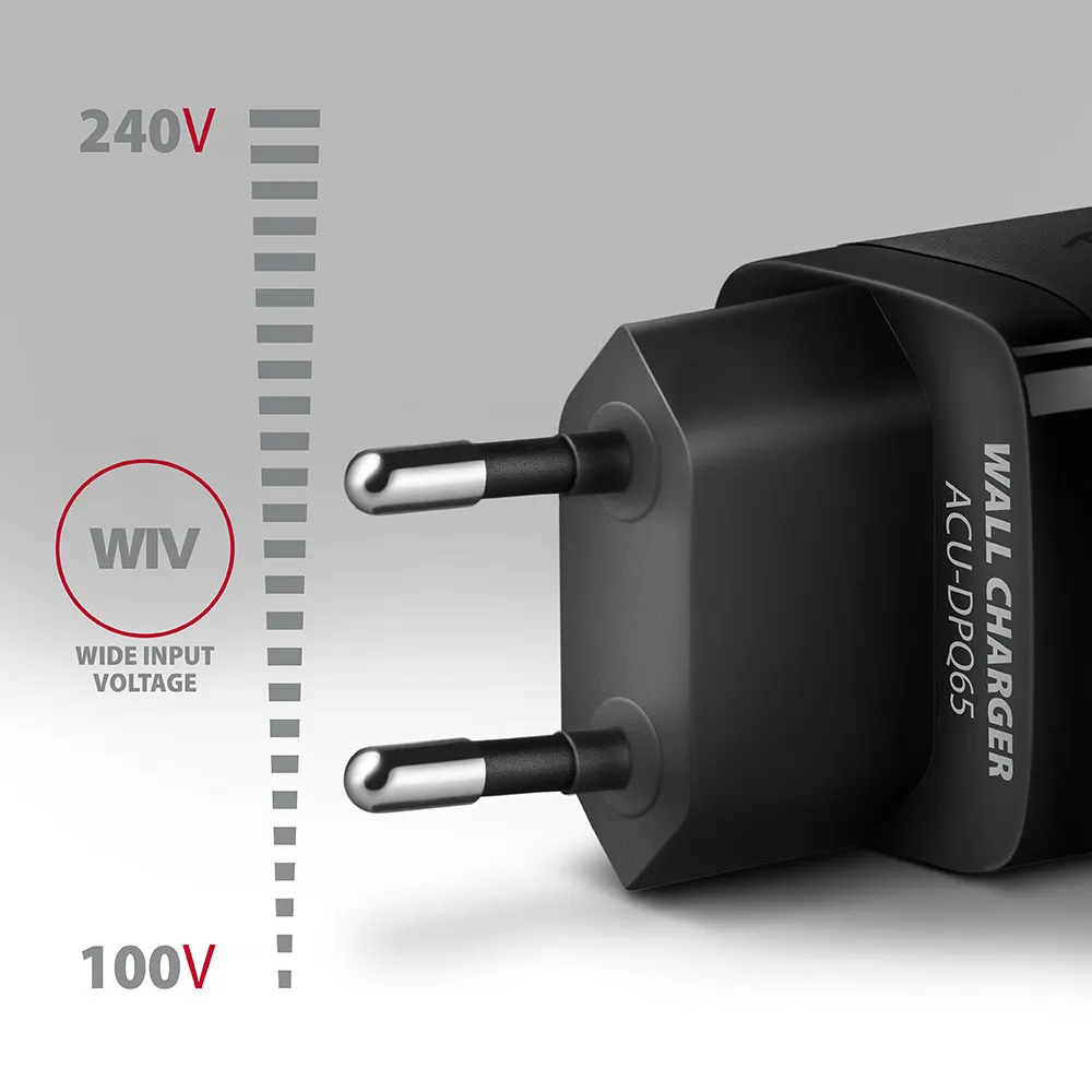 Axagon ACU-DPQ65. Laadija tüüp: Hoonesisene, Toiteallika tüüp: Vahelduvvool, Laadija ühilduvus: Mobiiltelefon, Märkmikarvuti, Sülearvuti, Nutitelefon, Nutikell, Tahvel, Universaalne. Sisendpinge: 100 - 240 V, Väljundpinge (max): 20 V. USB 2.0 portide arv: 1, USB C-tüüpi portide arv: 2, Kiirlaadimine, Toite kaitsefunktsioonid: Ülepinge, Ülekütmine, Ülekoormus, Lühis. Toote värv: Must