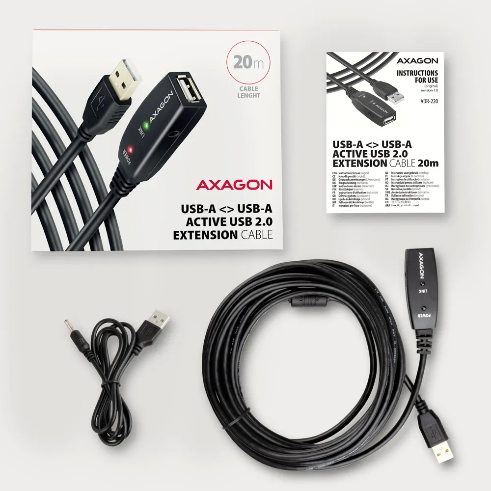 Axagon ADR-220 USB 2.0 A-M -> A-F active extension/repeater cable 20m - Kabel - Digital/Daten. Kaabli pikkus: 20 m. Pistmik 1: USB A, Pistmik 2: USB A, USB versioon: USB 2.0, Maksimaalne andmeedastuskiirus: 0,48 Gbit/s, Toote värv: Must