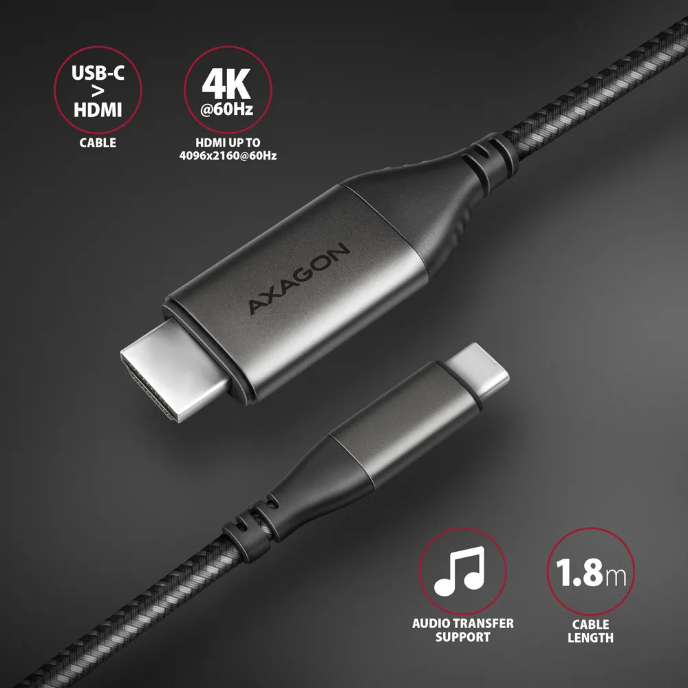 Axagon RVC-HI2MC. Kaabli pikkus: 1,8 m, Pistmik 1: USB tüüp-C, Pistmik 2: HDMI. Vastavussertifikaadid: RoHS, Sertifikaat: CE. Kaal: 70 g, Laius: 48 mm, Sügavus: 21 mm. Pakendi laius: 170 mm, Pakendi sügavus: 90 mm, Pakendi kõrgus: 30 mm. Kogus pakis: 1 tk