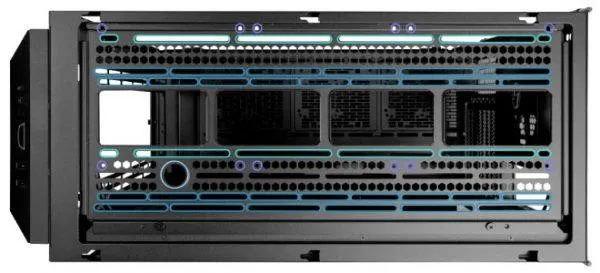 Mounting slots beside the motherboard are provided at 105mm apart (standard 120mm fan mounting points) to allow the installation of a distro plate or a reservoir/pump bracket.