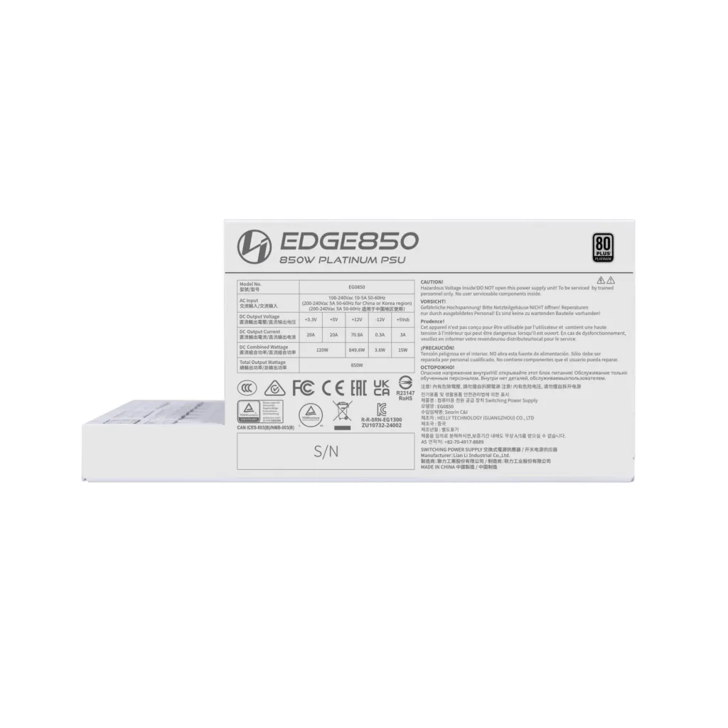 | Summary | Lian Li EG0850. Total power: 850 W, AC input voltage: 100 - 240 V, Combined power (+3.3V): 100 W. Motherboard power connector: 20-pin ATX, Motherboard power cable length: 30 cm, SATA power cable length: 120 mm. Purpose: PC, Power supply unit (PSU) form factor: SFX, 80 PLUS certification: 80 PLUS Gold. Product colour: White. Cables included: CPU, PCIe, Peripheral (Molex), SATA |
