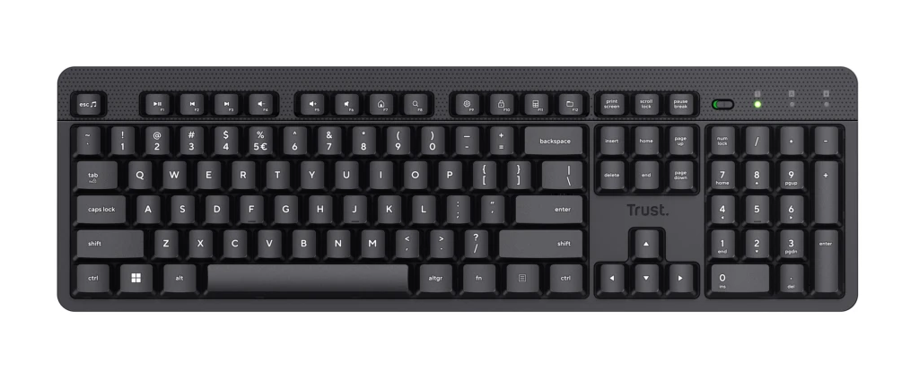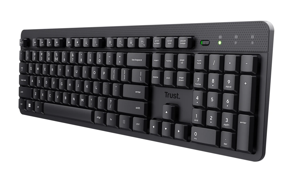 Trust Ody II. Klaviatuuri kujutegur: Täissuuruses (100%), Ühenduvustehnoloogia: Juhtmevaba, Seadme liides: Raadioside, Klaviatuuri klahvilüliti: Membraaniga klahvlüliti, Klaviatuuri paigutus: QWERTY, Soovituslik kasutus: Kontor. Toote värv: Must