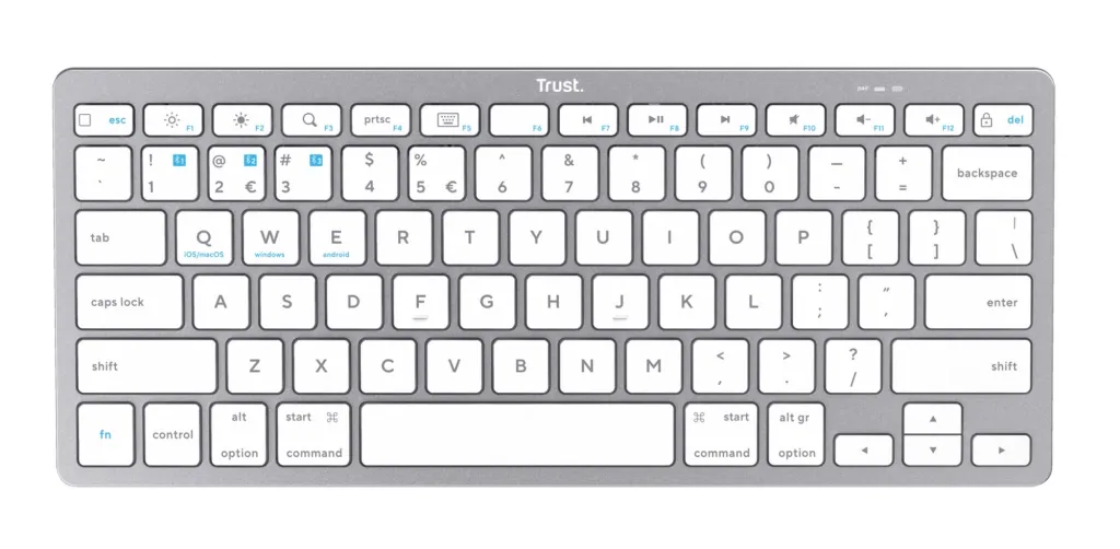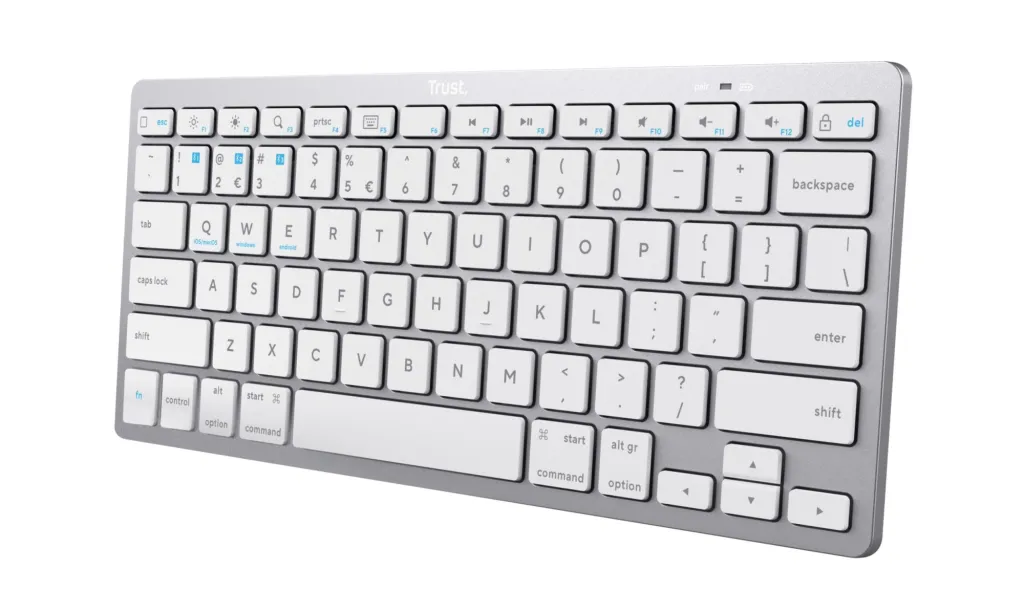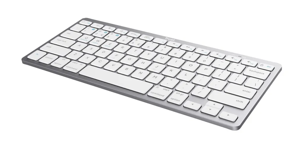 Summary Trust 24651. Keyboard form factor: 75%. Keyboard style: Straight. Connectivity technology: Wireless, Device interface: Bluetooth, Keyboard key switch: Scissor key switch, Keyboard layout: QWERTY, Keyboard number of keys: 85, Recommended usage: Universal. Product colour: Silver