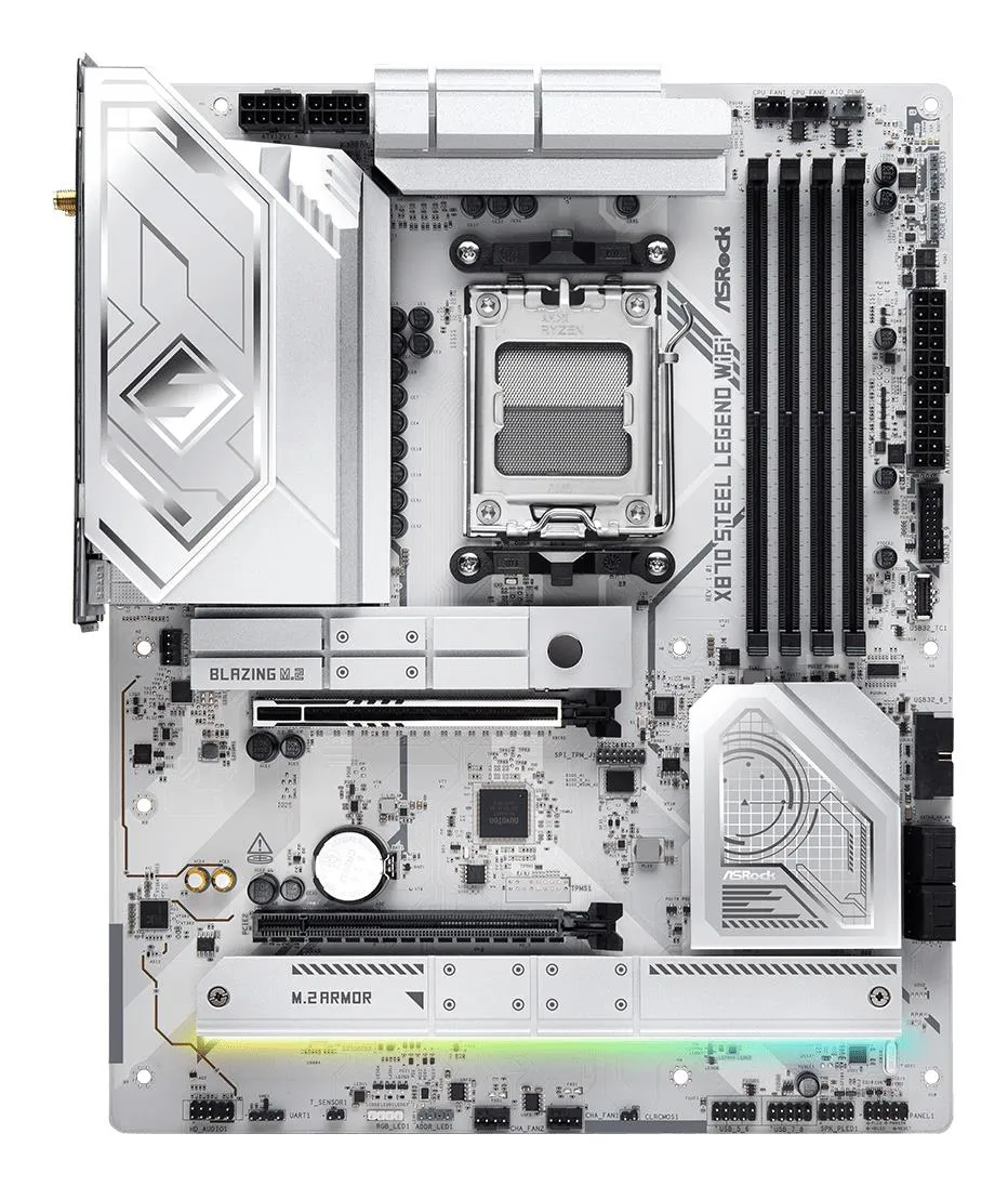 | Summary | Asrock X870 Steel Legend WiFi. Processor manufacturer: AMD, Processor socket: Socket AM5, Compatible processor series: AMD Ryzen™ 7, AMD Ryzen™ 9. Supported memory types: DDR5-SDRAM, Maximum internal memory: 256 GB, Memory slots type: DIMM. RAID levels: 0, 1, 10. Ethernet interface type: 2.5 Gigabit Ethernet, LAN controller: Realtek RTL8125-BG, Top Wi-Fi standard: Wi-Fi 7 (802.11be). Component for: PC, Motherboard form factor: ATX, Motherboard chipset family: AMD |