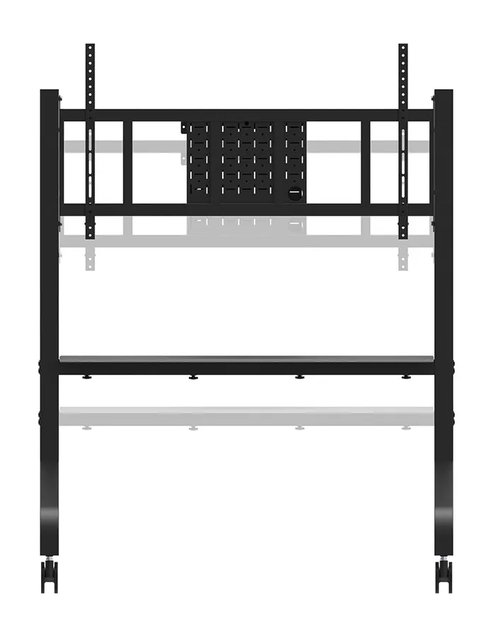 Designed with a sturdy structure, the MOVE Go XL offers the perfect solution for large and ultra-wide 105" (touch) screens. The floor stand offers manual height adjustment in 2 preset positions, ranging from 129 to 139 cm, ensuring optimal viewing heights. For extra security, the screen can be fixed in place by locking the brackets using a padlock (not included). Additionally, a multimedia shelf (front and back mountable) and lockable, ventilated hardware compartment with cable opening are included and optional for installation.