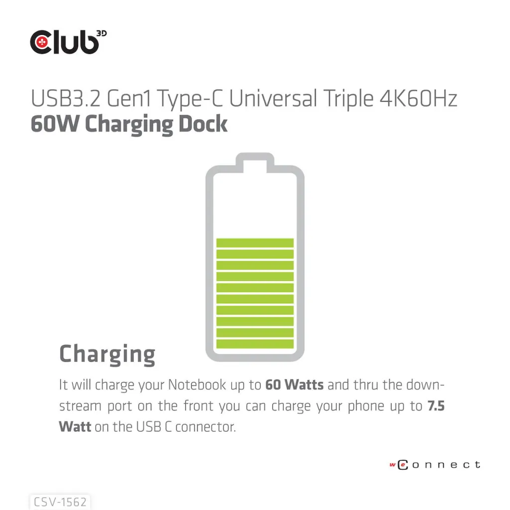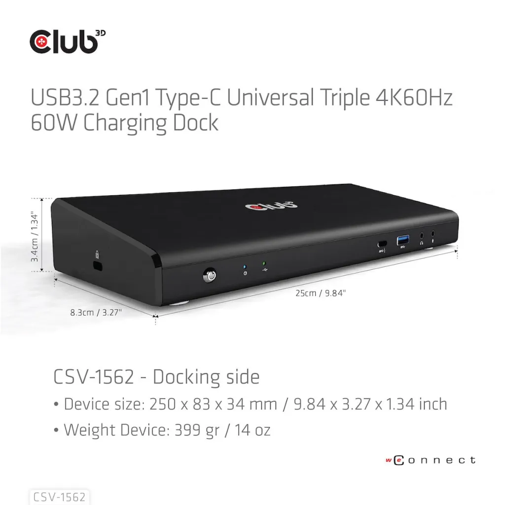 | Summary | CLUB3D The CSV-1562 is an USB3.2 Gen1 Type-C Universal Triple 4K30Hz Charging Docking Station and is DisplayLink® Certified. The Universal Charging Dock. Connectivity technology: Docking, Host interface: USB 3.2 Gen 1 (3.1 Gen 1) Type-C, Headphone connectivity: 3.5 mm. Product colour: Black, LED indicators: Power, Country of origin: China. Windows operating systems supported: Windows 10, Windows 11. Width: 250 mm, Depth: 83 mm, Height: 43 mm. Package width: 298 mm, Package depth: 92 mm, Package height: 150 mm |