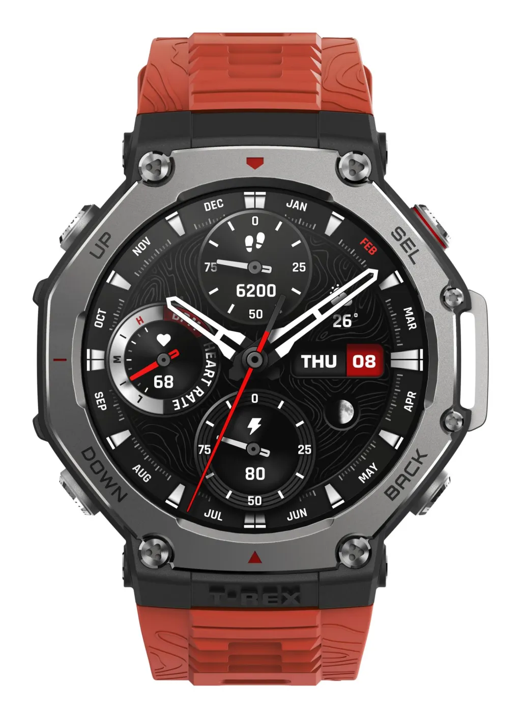 Amazfit T-Rex 3 Lava. Ekraani diagonaal: 3,81 cm (1.5"), Ekraani tehnoloogia: AMOLED, Ekraani resolutsioon: 480 x 480 pikslit, Puutetundlik ekraan. RAMi maht: 64 MB, Välkmälu: 32 GB. GPS (satelliit). Aku mahutavus: 700 mAh. Kaal: 68,3 g. Veekindel kuni: 100 m, Rihma materjal: Silikoon, Rihma värv: Oranž. Installitud operatsioonisüsteem: Zepp OS