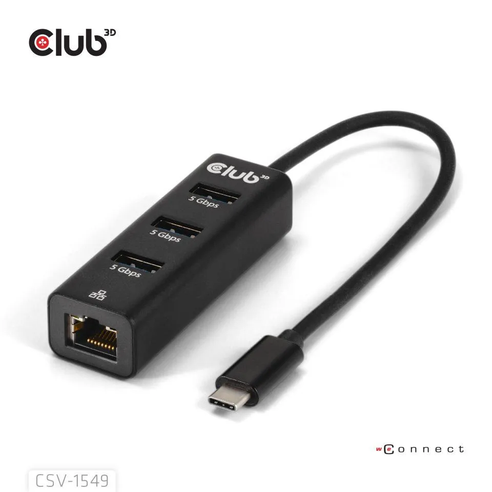 The Club 3D CSV-1549 is an USB 3.2 Gen1 Type-C Hub to 3 USB Type-A Ports with Gigabit Ethernet and is designed in a stylish manner and very slim which makes it easy to carry around. The CSV-1549 allows you simultaneous access to 3 x USB 3.2 Gen1 Type-A ports and the Ethernet 10/100/1000 Port from just one single USB 3.2 Gen1 Type-C up-link. The Device is downwards compatible to USB 2.0 standard, but this will have influence on the performance. The 3 USB ports are all USB Type-A and USB 3.2 Gen1 compliant with max 5Gbps data transmission. The Ethernet port is compliant to Gigabit Ethernet 10/100/1000 (RJ45) and full duplex with flow control.
