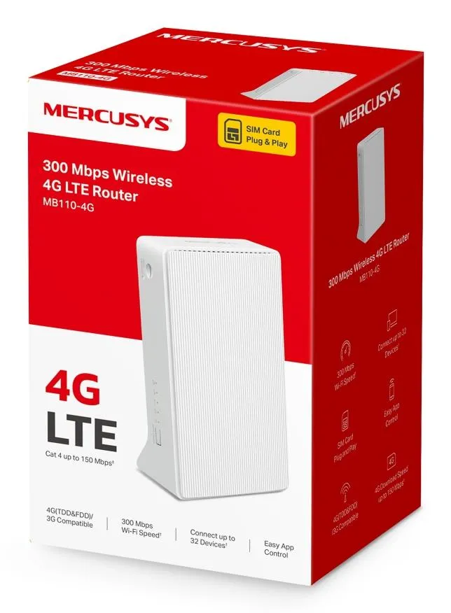 | Summary | Mercusys 300 Mbps Wireless N 4G LTE Router. WAN connection type: RJ-45. Wi-Fi band: Single-band (2.4 GHz), Top Wi-Fi standard: Wi-Fi 4 (802.11n), WLAN data transfer rate (max): 300 Mbit/s. Ethernet LAN interface type: Ethernet, Ethernet LAN data rates: 10,100 Mbit/s, Cabling technology: 10/100Base-T(X). Mobile network generation: 4G, 3G standards: HSPA, HSPA+, UMTS, 4G standard: LTE-TDD & LTE-FDD. Security algorithms: 64-bit WEP, 128-bit WEP, WPA, WPA-PSK, WPA2, WPA2-PSK |
