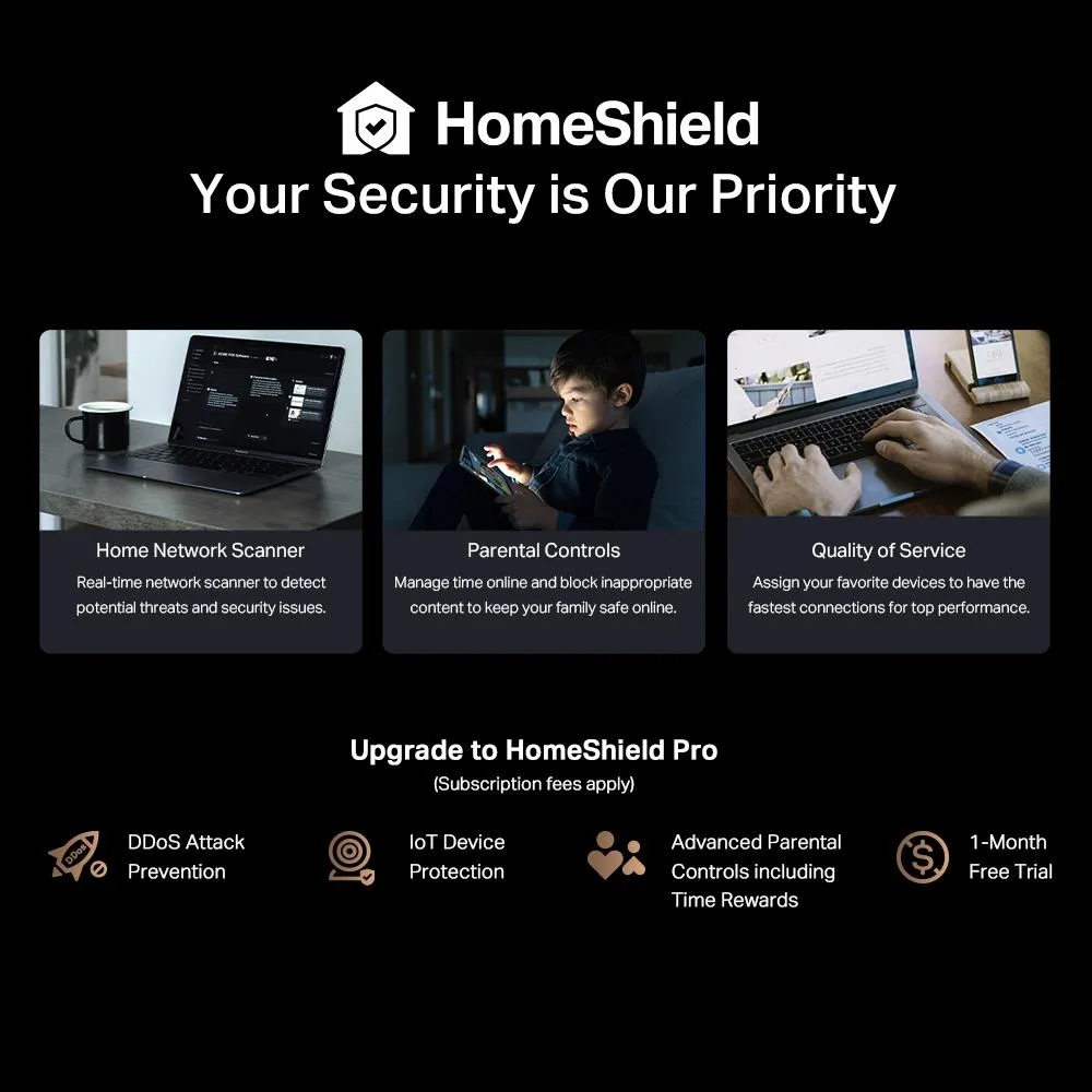 With TP-Link HomeShield, enjoy advanced security features that deliver a safe environment that protects your family and network's data and privacy.