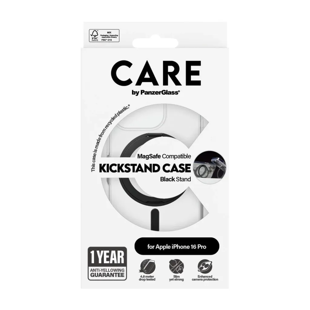 PanzerGlass CARE™ by ® Case Transparent w. Black Kickstand & MagSafe iPhone 16 Pro. Karbi tüüp: Kate, Brändiühilduvus: Apple, Ühilduvus: Apple - iPhone 16 Pro, Toote värv: Must