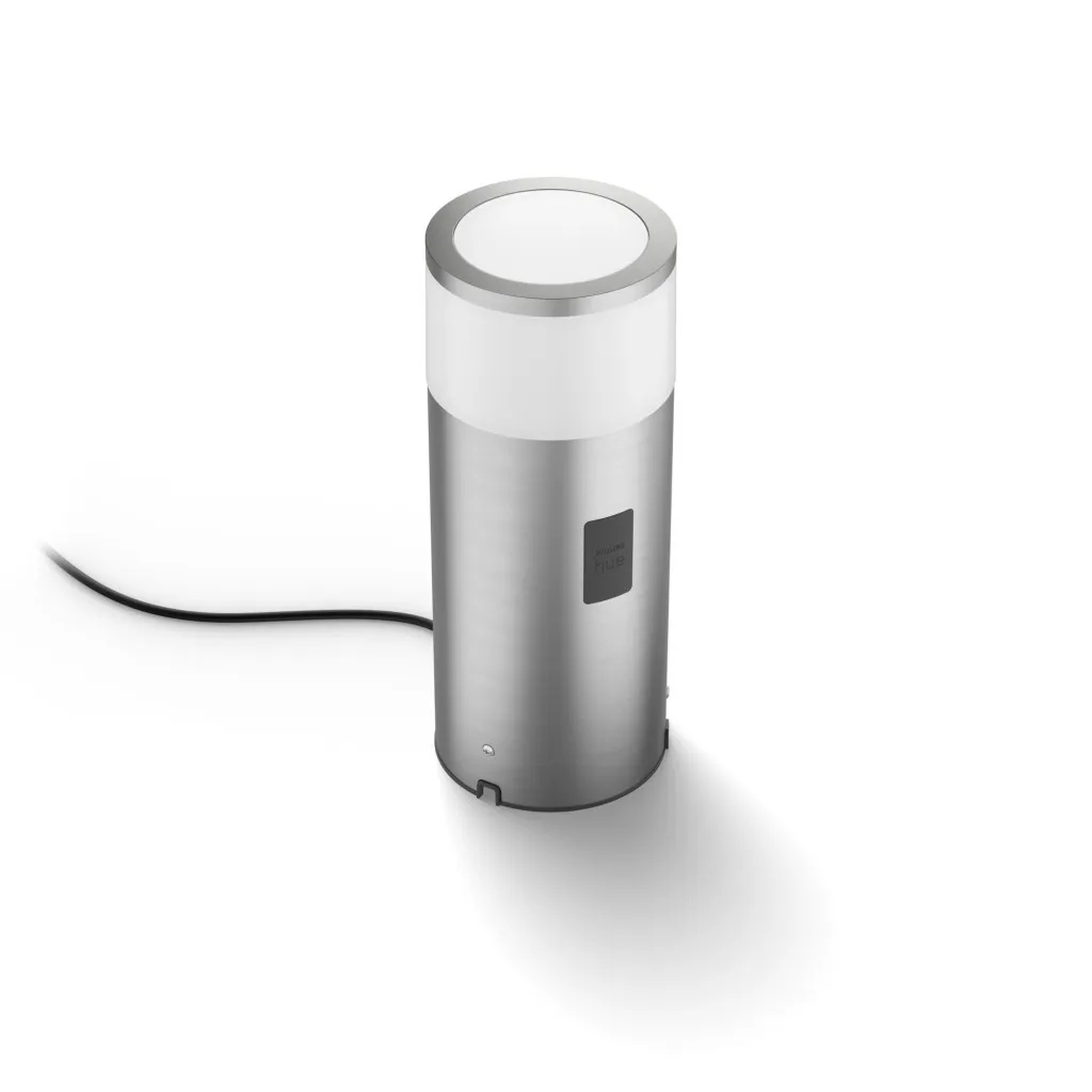 Philips Hue White and colour ambience Välisvalgusti Calla. Tüüp: Õuevalgustid postamentidele/postidele, Toote värv: Kroom, Korpuse materjal: Roostevaba teras. Tarviku/korgi tüüp: Mittevahetatav(ad) pirn(id), Pirni tüüp: LED, Pirni võimsus: 8 W. Juhtme pikkus: 5 m. Toiteallika tüüp: Vahelduvvool, Sisendpinge: 220 - 240 V, AC-sisendsagedus: 50 - 60 Hz. Laius: 102 mm, Sügavus: 102 mm, Pikkus: 102 mm