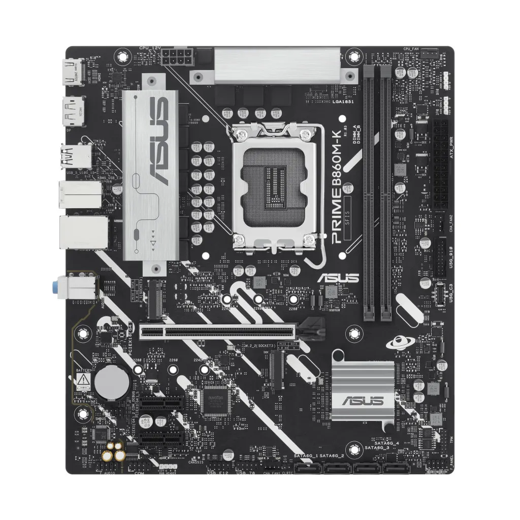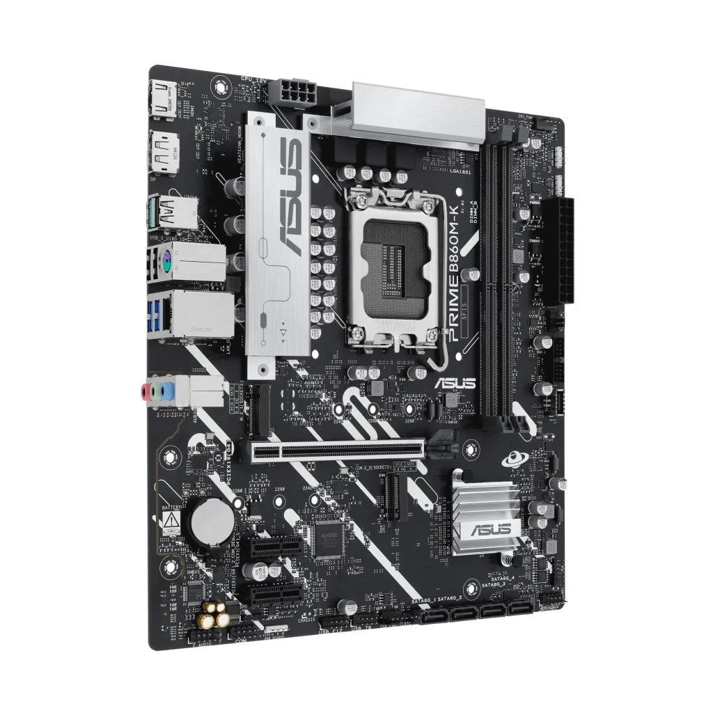 ASUS PRIME B860M-K. Protsessori tootja: Intel, Protsessori pesa: LGA 1851 (Socket V1), Ühilduvad protsessoriseeriad: Intel Core Ultra (Series 2). Toetatud mälutüübid: DDR5-SDRAM, Maksimaalne sisemälu: 128 GB, Mälupesa tüüp: DIMM. Kõvaketta ühenduse tüüp: M.2, SATA III, Toetatud ketaste tüübid: HDD & SSD, RAID-tasemed: 0, 1, 5, 10. Ethernet-liidese tüüp: 2.5 Gigabit Ethernet. Komponent: PC, Emaplaadi kujutegur: Mikro ATX, Emaplaadi kiibistik: Intel