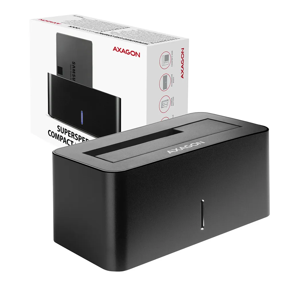 Axagon ADSA-SN. Varunduse meedia tüüp: HDD, SSD, Ketta liides: Jada ATA, Jada ATA II, Jada ATA III, Toetatud ketaste suurused: 2.5,3.5". Hostiliides: USB 3.2 Gen 1 (3.1 Gen 1) Type-A. Toote värv: Must, Materjal: Alumiinium, Plast, Maksimaalne andmeedastuskiirus: 5 Gbit/s. AC-sisendpinge: 100 - 240 V, Väljundpinge: 12 V, Väljundvool: 2 A. Laius: 130 mm, Sügavus: 59 mm, Kõrgus: 65 mm