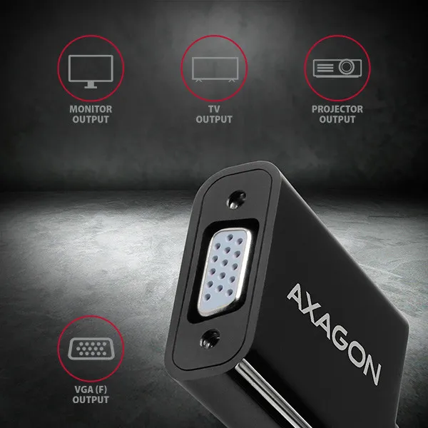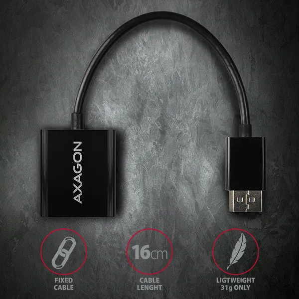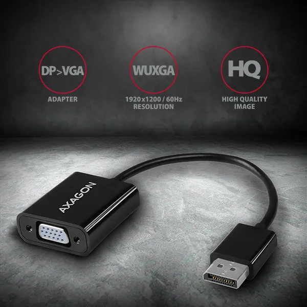 Axagon RVD-VGN. Kaabli pikkus: 0,15 m, Pistmik 1: DisplayPort, Pistmik 2: VGA (D-Sub). Vastavussertifikaadid: RoHS, Sertifikaat: CE. Kaal: 31 g, Laius: 16 mm, Sügavus: 42 mm. Pakendi laius: 25 mm, Pakendi sügavus: 90 mm, Pakendi kõrgus: 180 mm. Kogus pakis: 1 tk