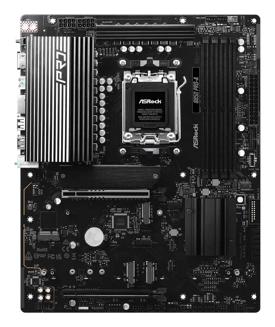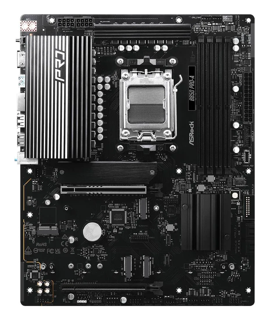 | Summary | Asrock B850 Pro-A. Processor manufacturer: AMD, Processor socket: Socket AM5, Compatible processor series: AMD Ryzen 7000 Series, AMD Ryzen 8000 Series, AMD Ryzen 9000 Series. Supported memory types: DDR5-SDRAM, Maximum internal memory: 256 GB, Memory slots type: DIMM. Supported storage drive interfaces: PCI Express 3.0, PCI Express 4.0, PCI Express 5.0, SATA III, Supported storage drive types: HDD & SSD, RAID levels: 0, 1, 10. Maximum resolution: 3840 x 2160 pixels. USB connector type: USB Type-A, USB Type-C |