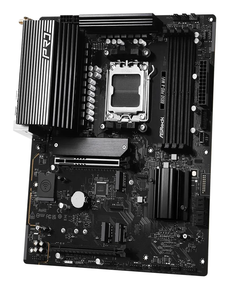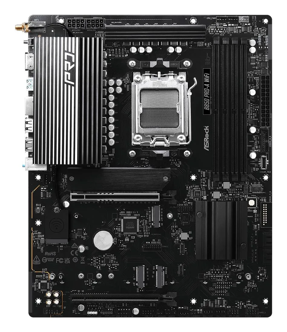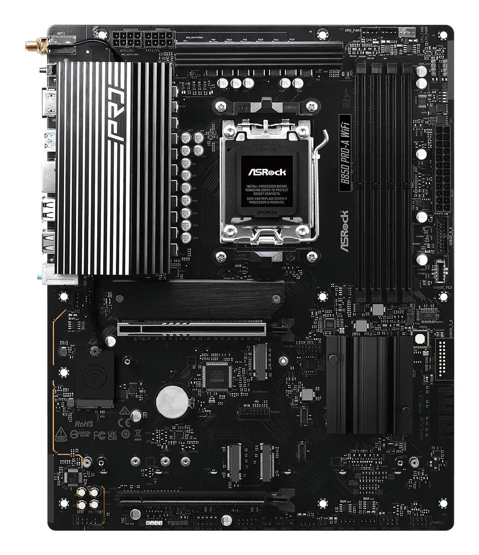 | Summary | Asrock B850 Pro-A WiFi. Processor manufacturer: AMD, Processor socket: Socket AM5, Compatible processor series: AMD Ryzen 7000 Series, AMD Ryzen 8000 Series, AMD Ryzen 9000 Series. Supported memory types: DDR5-SDRAM, Maximum internal memory: 256 GB, Memory slots type: DIMM. Supported storage drive interfaces: PCI Express 4.0, PCI Express 5.0, SATA III, Supported storage drive types: HDD & SSD, RAID levels: 0, 1, 10. Maximum resolution: 3840 x 2160 pixels. USB connector type: USB Type-A, USB Type-C |
