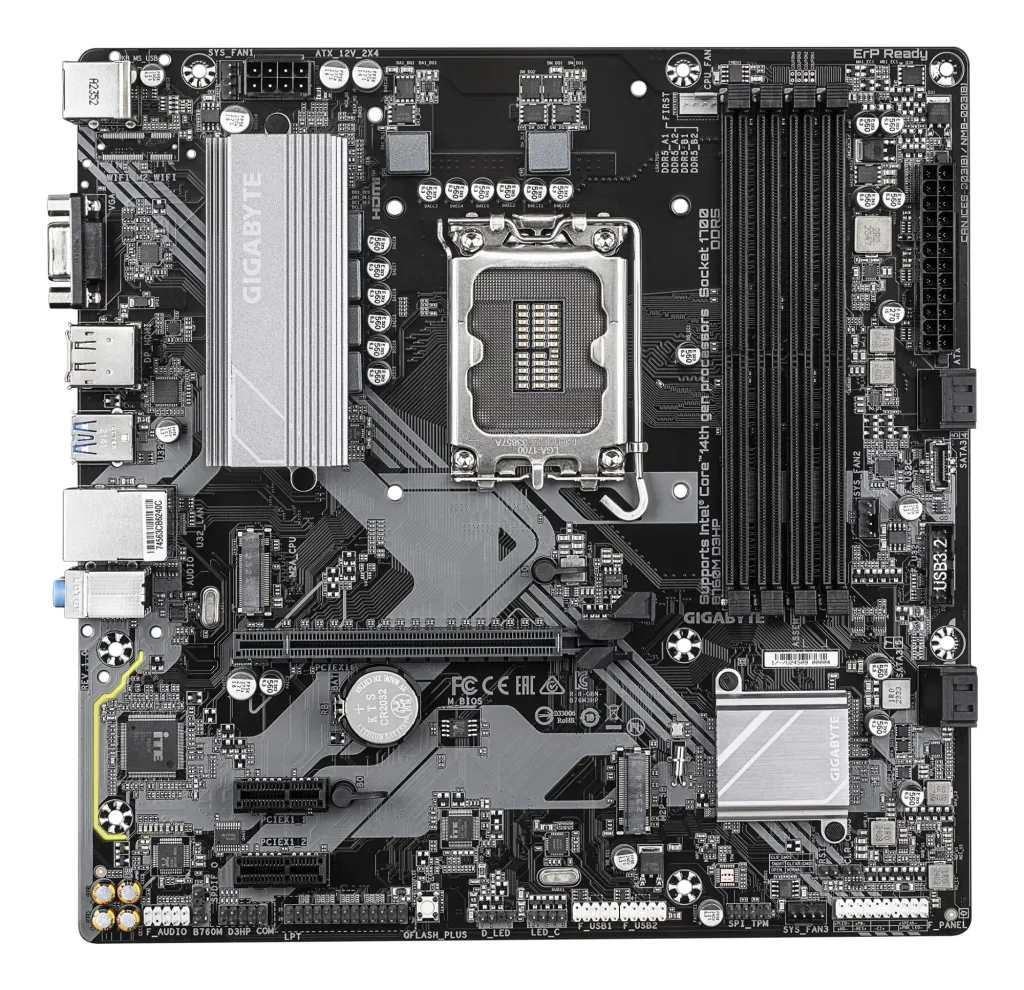 | Summary | GIGABYTE B760M D3HP Motherboard - Intel Core 14th Gen CPUs, 4+1+1 Phases VRM, up to 5600MHz DDR5, 2xPCIe 4.0 M.2, GbE LAN, USB 3.2 Gen 1. Processor manufacturer: Intel, Processor socket: LGA 1700, Compatible processor series: Intel® Celeron®, Intel Core i3 12th Gen, Intel Core i3 13th Gen, Intel Core i3 14th Gen, Intel.... Supported memory types: DDR5-SDRAM, Maximum internal memory: 256 GB, Memory slots type: DIMM. Supported storage drive interfaces: M.2, SATA III, Supported storage drive types: HDD & SSD, RAID levels: 0, 1, 5, 10. Maximum resolution: 4096 x 2304 pixels. Ethernet interface type: Gigabit Ethernet, LAN controller: Realtek RTL8111H |