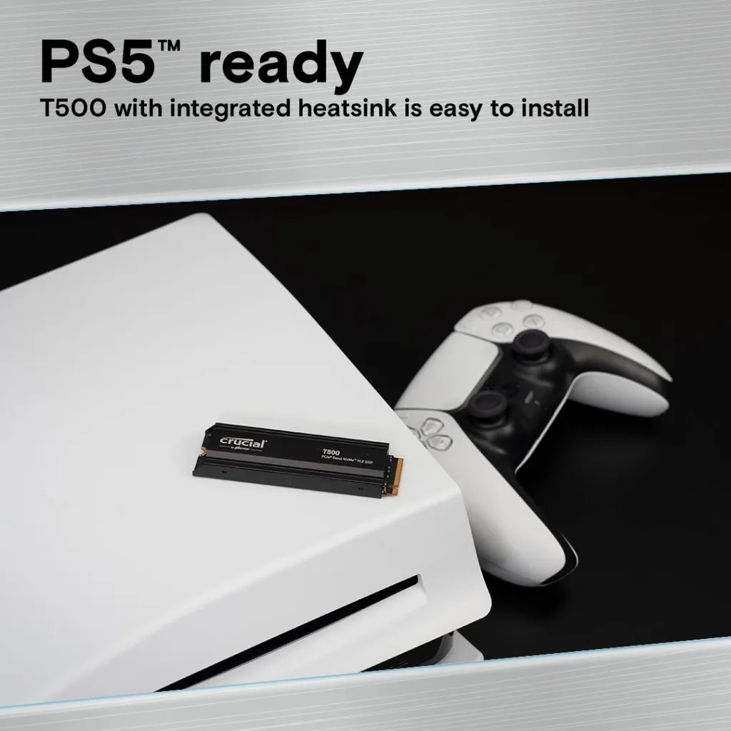 Fuel your system performance with the Crucial® T500 Gen4 NVMe® SSD. Experience faster gaming – perfect for PS5™ upgrades. Amp up your creative potential with solid state storage that moves as fast as you need it to. Heavy tasks are no problem with better performance to power efficiency, and our heatsink gives you quiet heat dissipation in a sleek design.