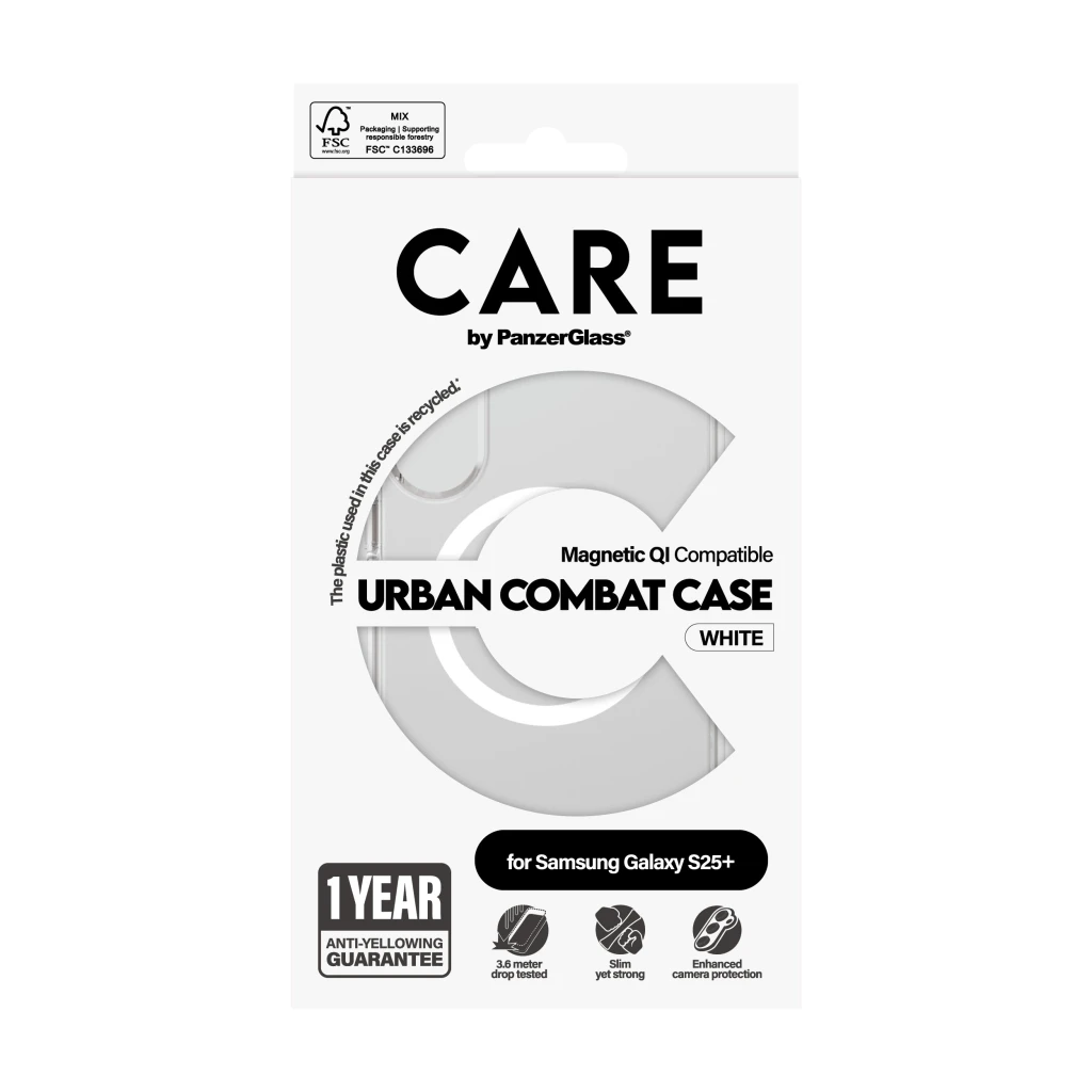 PanzerGlass CARE™ by ® Urban Combat Case Transparent w. White Qi Compatible Samsung Galaxy S25+. Karbi tüüp: Kate, Brändiühilduvus: Samsung, Ühilduvus: Samsung - Galaxy S25+, Toote värv: Läbipaistev