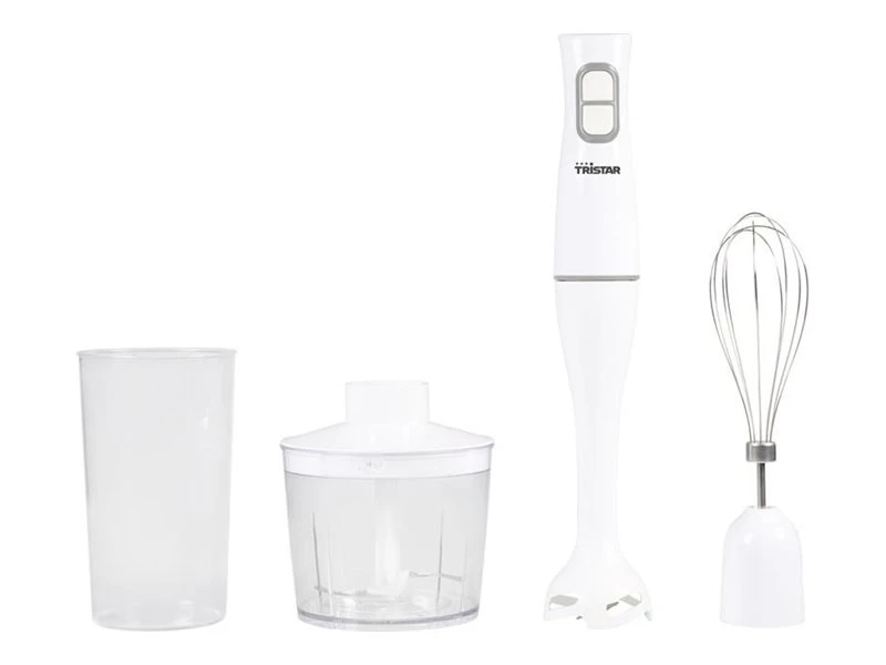 Tristar MX-4851. Tüüp: Saumikser, Toote värv: Valge, Juhtme pikkus: 1 m. Kannu mahutavus: 0,7 l, Kiiruskontrolli tüüp: Astmeteta, Kontrolli tüüp: Nööbid. Segamiskausi materjal: Plast, Korpuse materjal: Roostevaba teras. Võimsus: 350 W, Toiteallikas: Vahelduvvool, AC-sisendpinge: 230 V