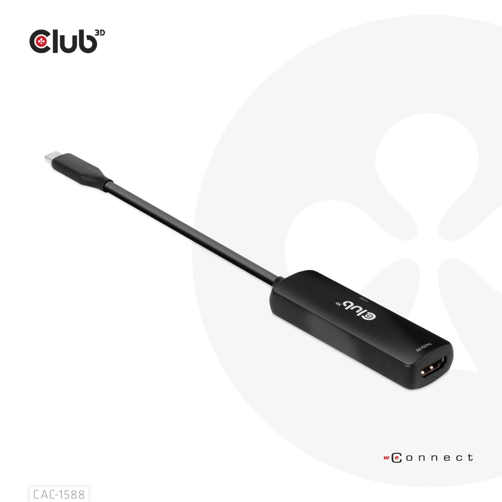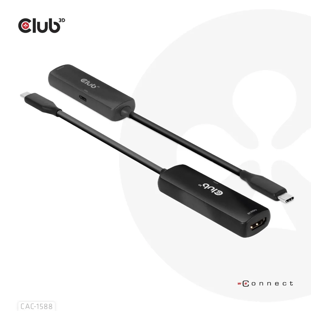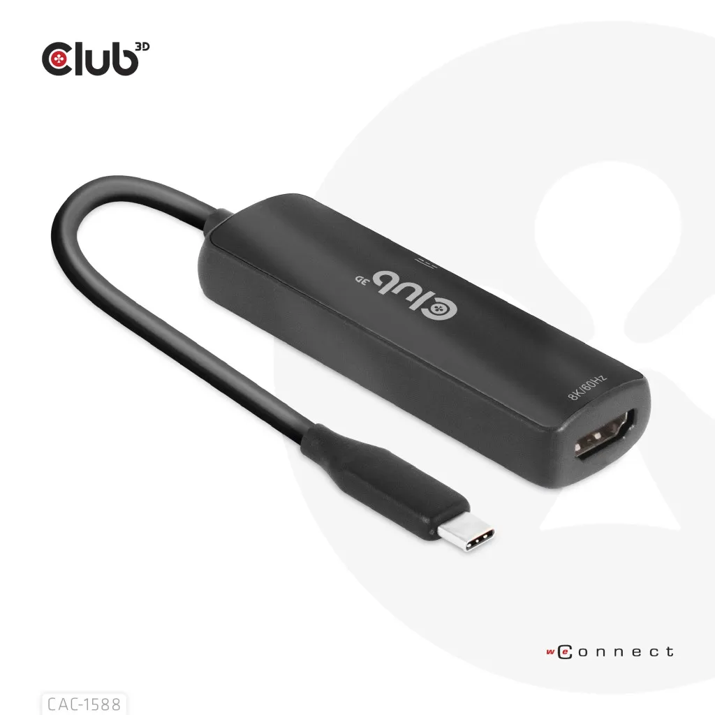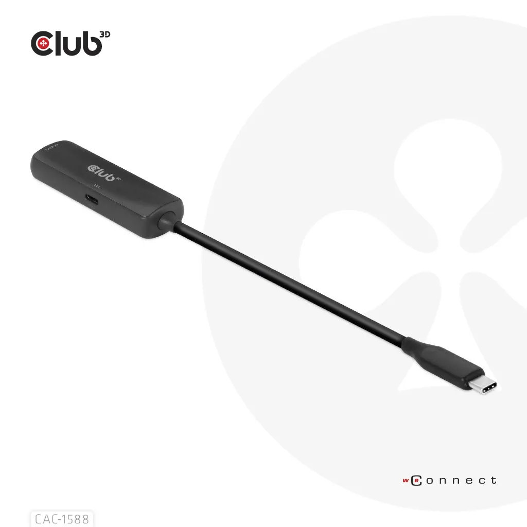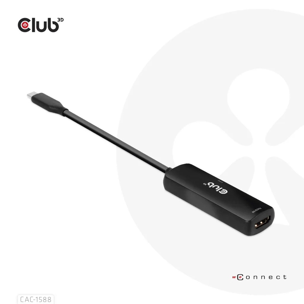 CLUB3D CAC-1588. Kaabli pikkus: 0,17 m, Pistmik 1: USB tüüp-C, Pistmik 2: HDMI. Sertifikaat: Meets ROHS, FCC, and CE EMI requirements. Konnektori 1 mõõtmed (LxSxK): 29 x 12 x 7 mm, Kaal: 40 g. Pakendi laius: 100 mm, Pakendi sügavus: 100 mm, Pakendi kõrgus: 35 mm. Kogus pakis: 1 tk, Pakendi sisu: CAC- 1588 USB Gen2 Type-C to HDMI™ 8K60Hz or 4K120Hz HDR10+ with DSC1.2 with Power Delivery 3.0...