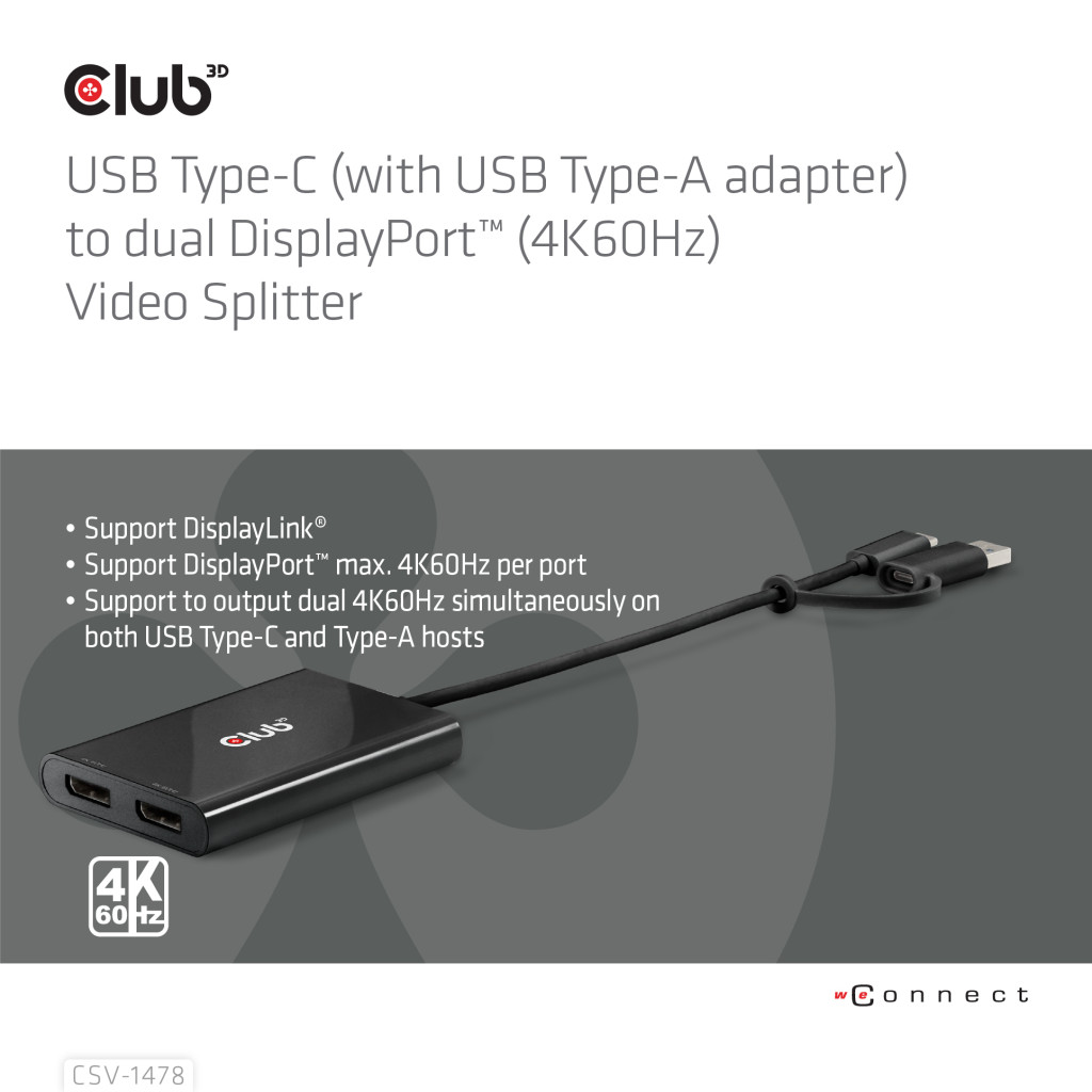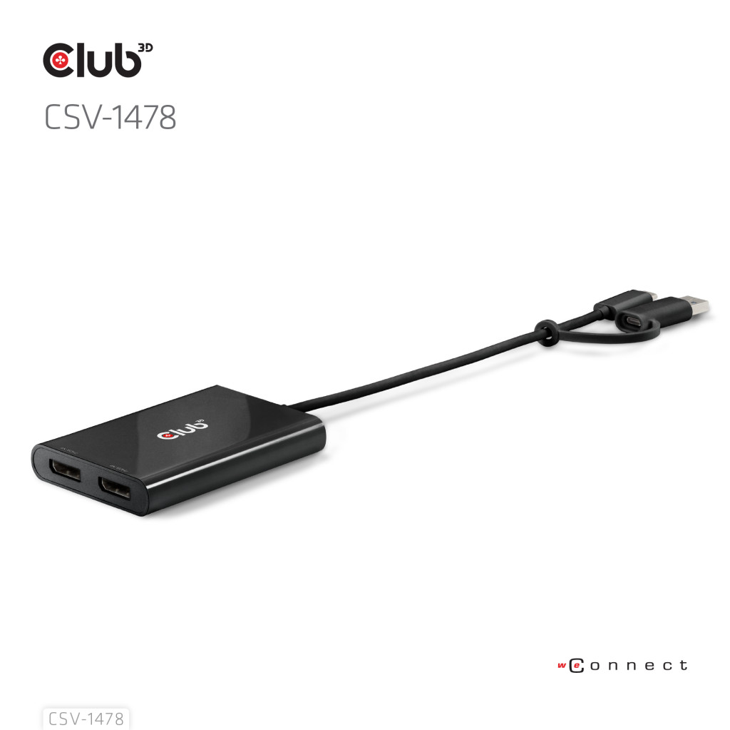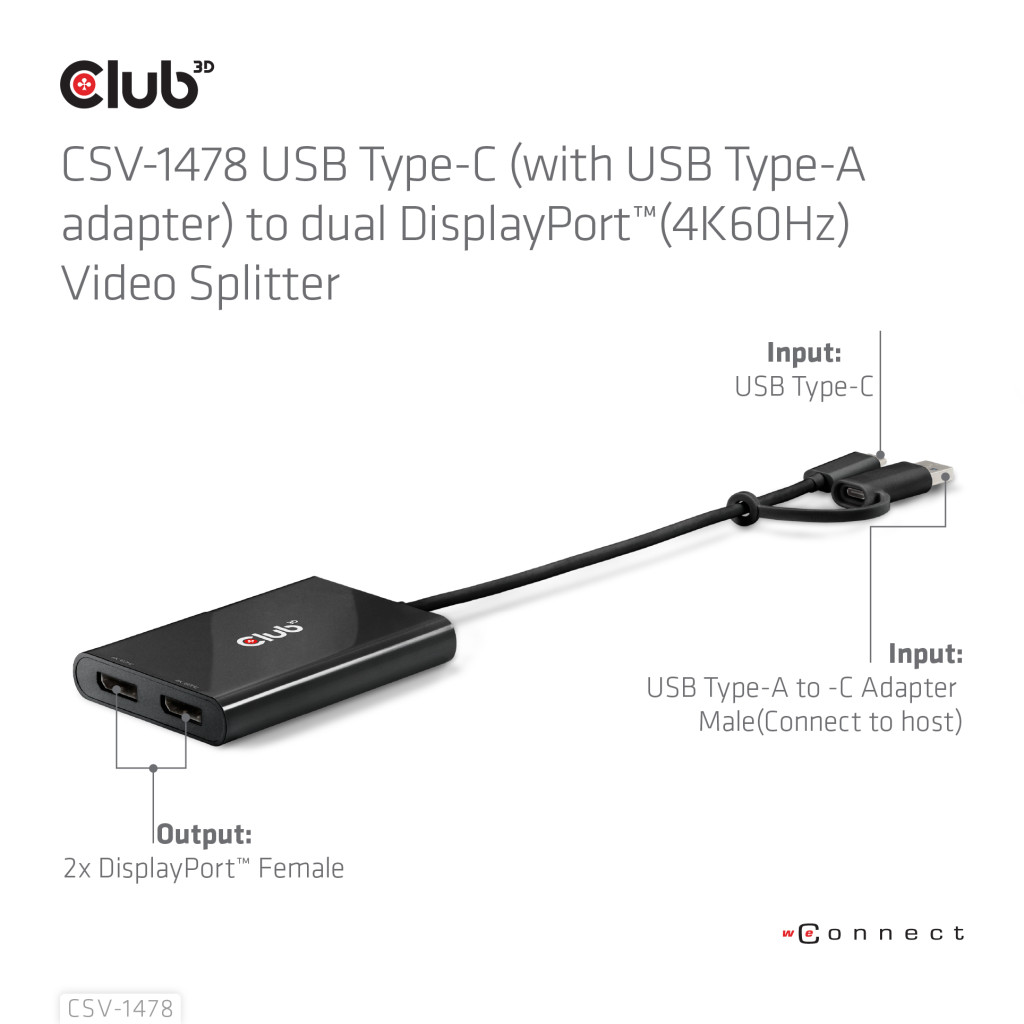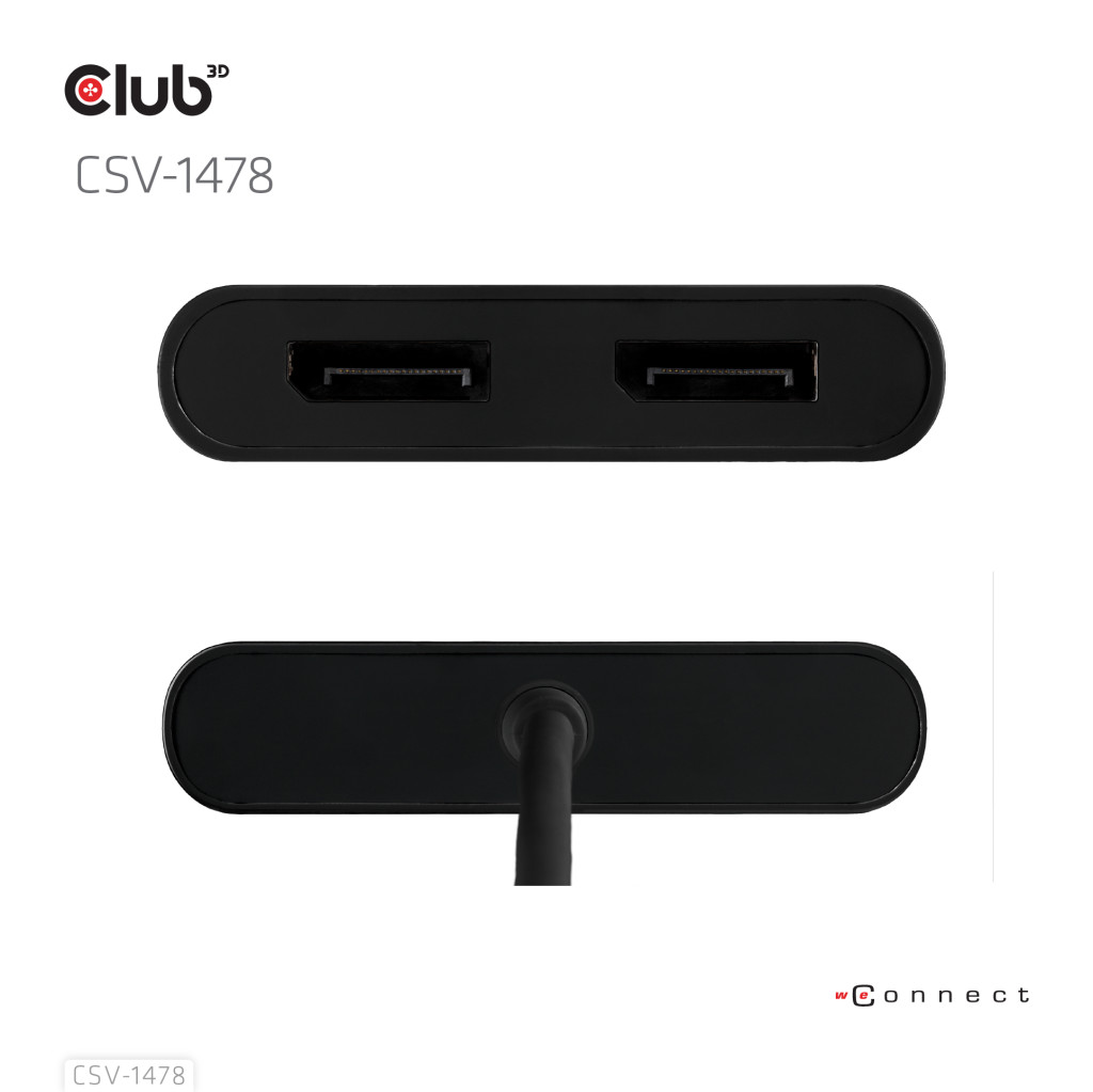 CLUB3D CSV-1478. Videopordi tüüp: USB tüüp-C, Videoväljund: 2x DisplayPort. Toote värv: Must