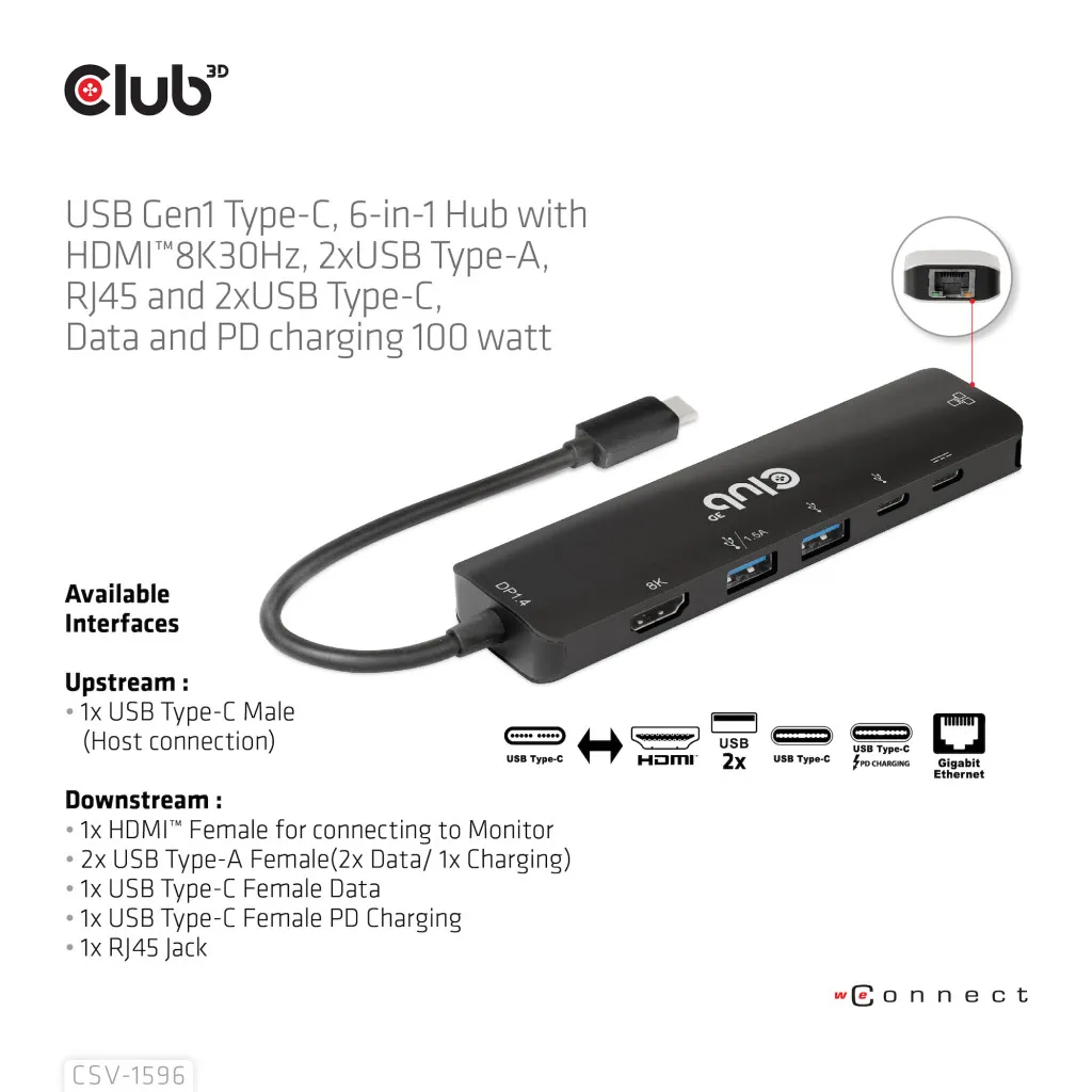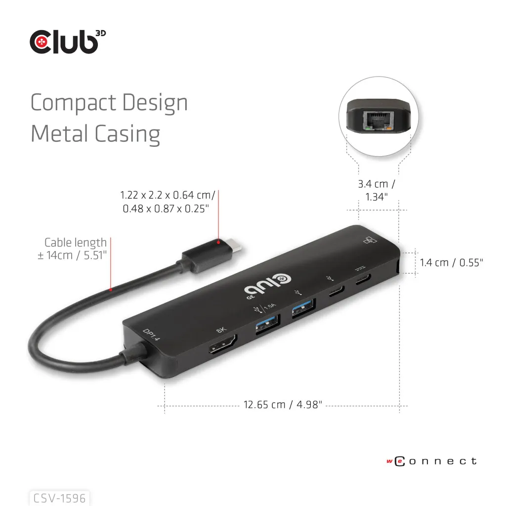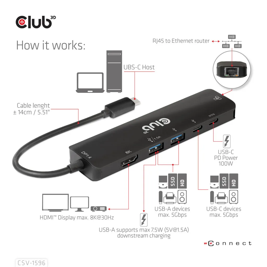 CLUB3D CSV-1596. Hostiliides: USB 3.2 Gen 1 (3.1 Gen 1) Type-C, USB Power Delivery kuni: 100 W, HDCP versioon: 1.4/2.3. Ethernet LAN-i andmeedastuskiirused: 100,1000 Mbit/s. Toote värv: Must, HD tüüp: 8K Ultra HD, Maksimaalne värskendussagedus: 120 Hz. Väljundpinge: 5 V, Väljundvool: 1,5 A, Elektritarbimine (max): 7,5 W. Laius: 126 mm, Sügavus: 32 mm, Kõrgus: 35 mm