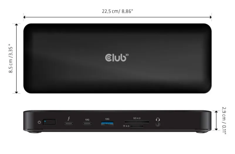 CLUB3D CSV-1583. Ühenduvustehnoloogia: Juhtmega ühendatud, Hostiliides: Thunderbolt 4. Toote värv: Must, Ühilduvad mälukaardid: MicroSD (TransFlash), SD, Andmeedastuskiirus: 40 Gbit/s. Toitekaabli pikkus: 1 m, Thunderbolt 4 kaabli pikkus: 0,8 m. Toetatud Windowsi operatsioonisüsteemid: Windows 10. Laius: 85 mm, Sügavus: 225 mm, Kõrgus: 22 mm