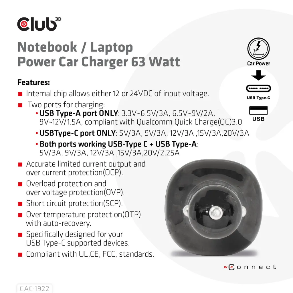 CLUB3D USB KFZ-Ladegerät 1xUSB C A 63W 12/24V retail