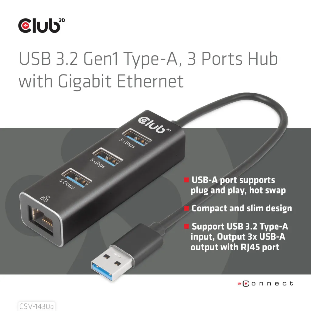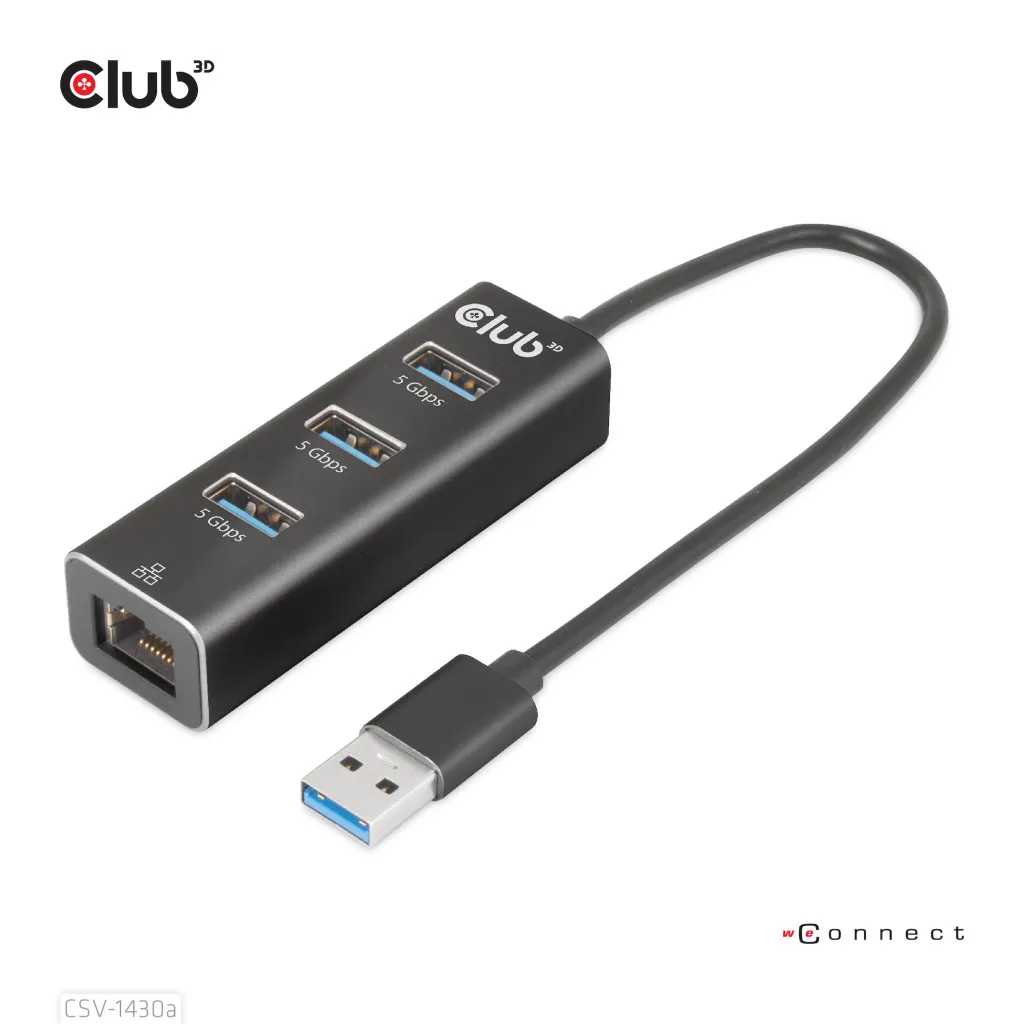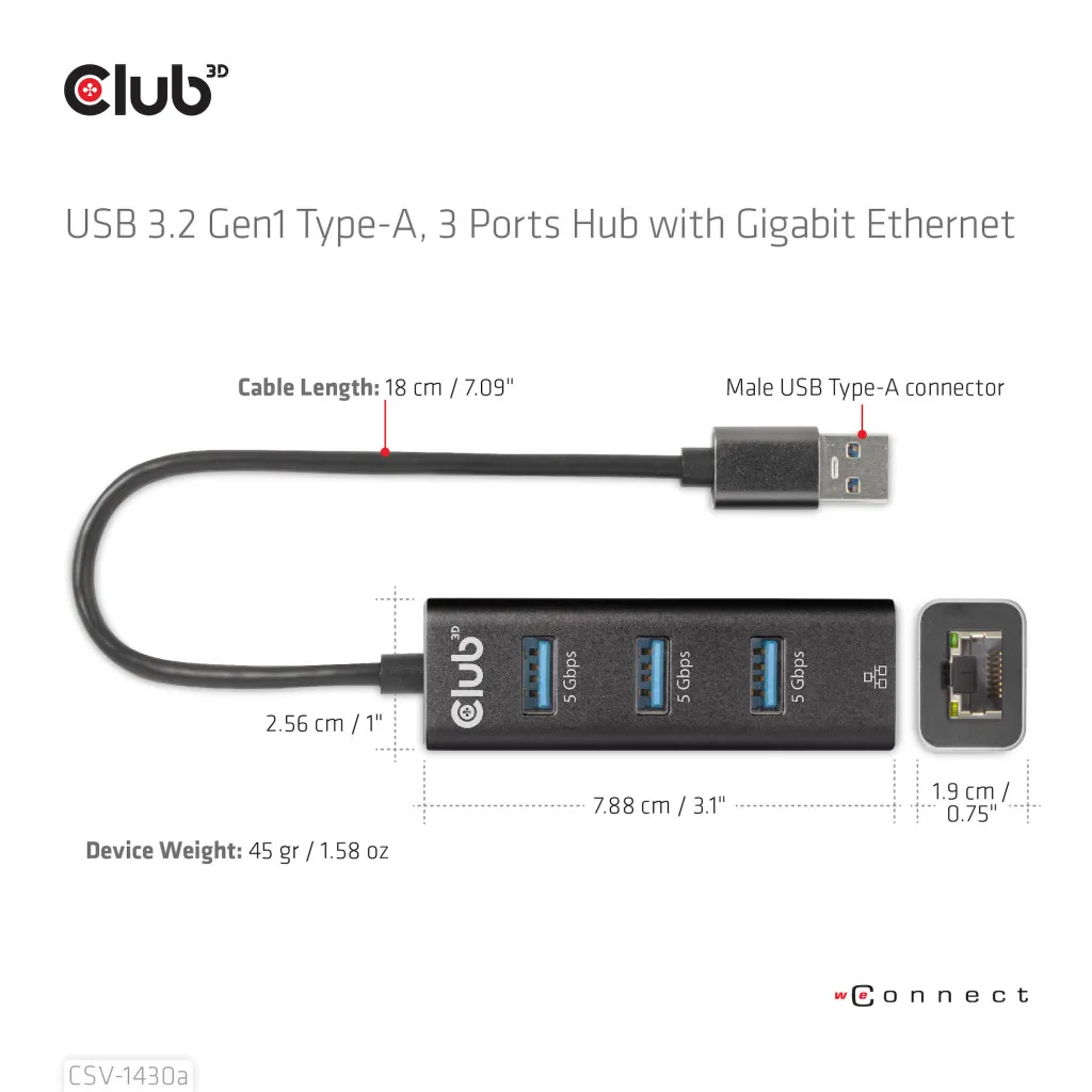 CLUB3D CSV-1430a. Ühenduvustehnoloogia: Juhtmega ühendatud, Hostiliides: USB 3.2 Gen 1 (3.1 Gen 1) Type-A. Ethernet LAN-i andmeedastuskiirused: 1000 Mbit/s. Toote värv: Must. Toiteallika tüüp: USB, Toitepistmik: USB tüüp-C. Laius: 78,8 mm, Sügavus: 25,6 mm, Kõrgus: 19 mm