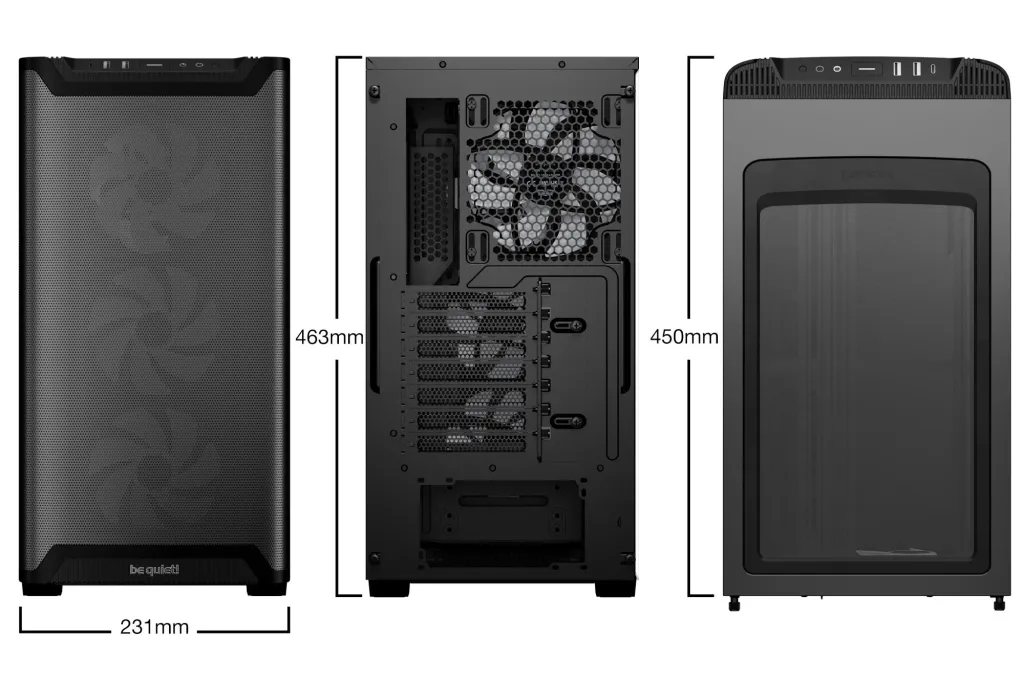 | Summary | be quiet! Pure Base 501 LX Black. Form factor: Midi Tower, Type: PC, Product colour: Black. Supported power supply form factors: ATX, PS2. Front fans installed: 3x 120 mm, Front fans diameters supported: 120,140 mm, Rear fans installed: 1x 140 mm. Supported HDD sizes: 2.5,3.5". Width: 231 mm, Depth: 450 mm, Height: 463 mm |