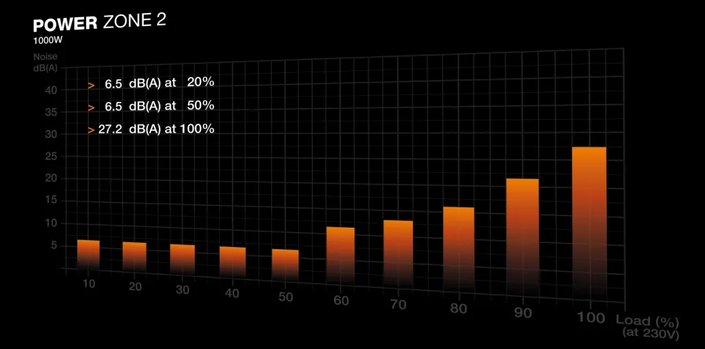 A large Pure Wings 3 140mm fan is keeping Power Zone 2 1000W cool. While under low load, the fan turns off completely until its services are needed again for more demanding operations. This post-ventilation requires a short cooldown period of 2-5 minutes to avoid frequent and annoying starts and stops of the fan. Combined with the large fan for active cooling, this power supply is exceptionally silent in all load scenarios.