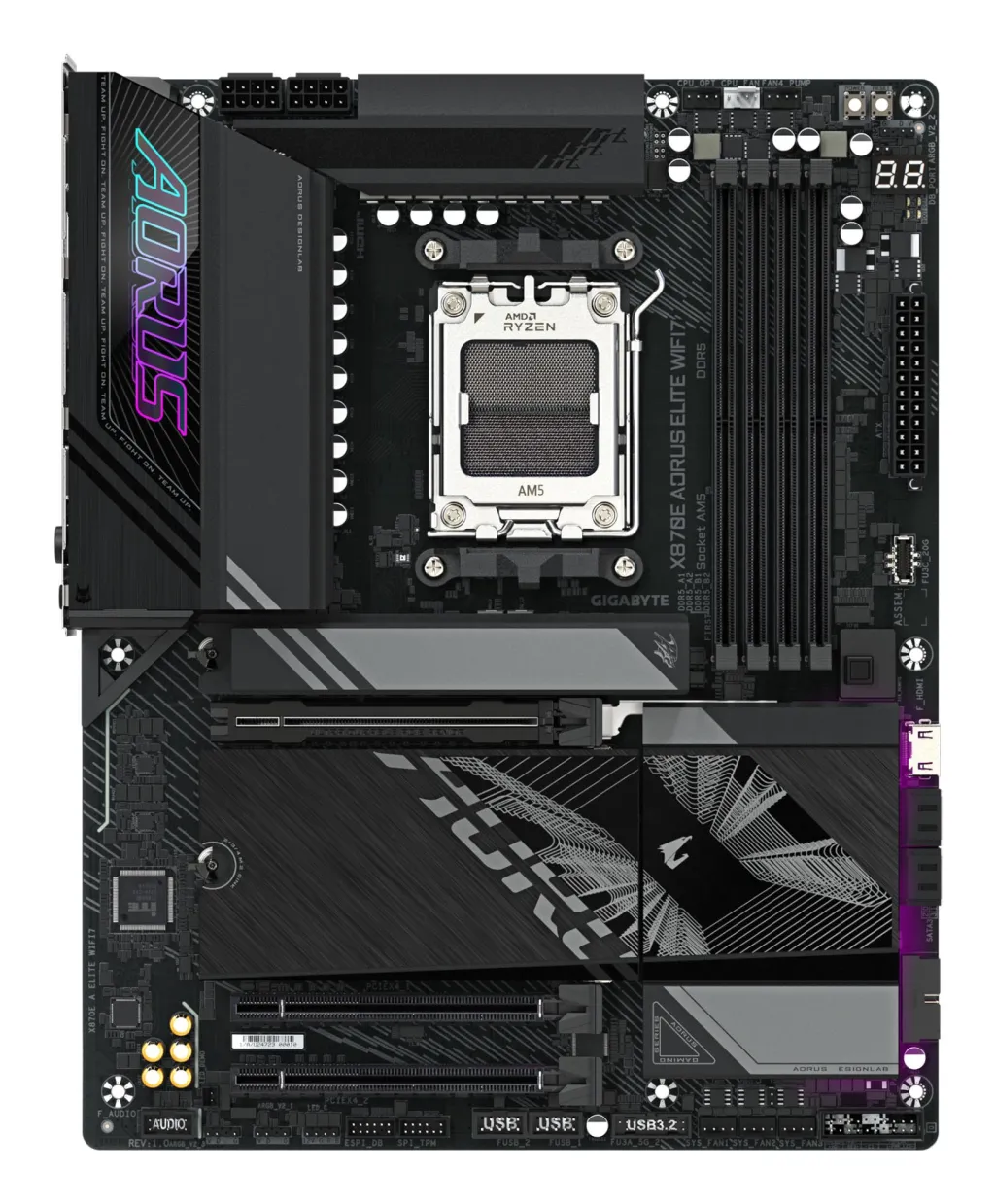 | Summary | GIGABYTE X870E AORUS ELITE WIFI7 Motherboard - Supports AMD Ryzen 9000 CPUs, 16+2+2 Phases Digital VRM, up to 8000Hz DDR5 (OC), 3xPCIe 5.0 + 1xPCIe 4.0, Wi-Fi 7, 2.5GbE LAN, USB 4. Processor manufacturer: AMD, Processor socket: Socket AM5, Compatible processor series: AMD Ryzen 7000 Series, AMD Ryzen 8000 Series, AMD Ryzen 9000 Series. Supported memory types: DDR5-SDRAM, Maximum internal memory: 256 GB, Memory slots type: DIMM. Supported storage drive interfaces: M.2, SATA III, Supported storage drive types: HDD & SSD, RAID levels: 0, 1, 10. Ethernet interface type: 2.5 Gigabit Ethernet, LAN controller: Realtek RTL8125, Top Wi-Fi standard: Wi-Fi 7 (802.11be). Component for: PC, Motherboard form factor: ATX, Motherboard chipset family: AMD |