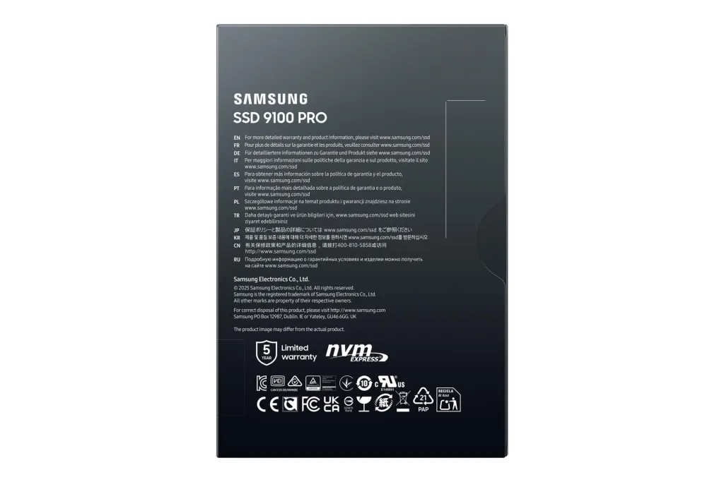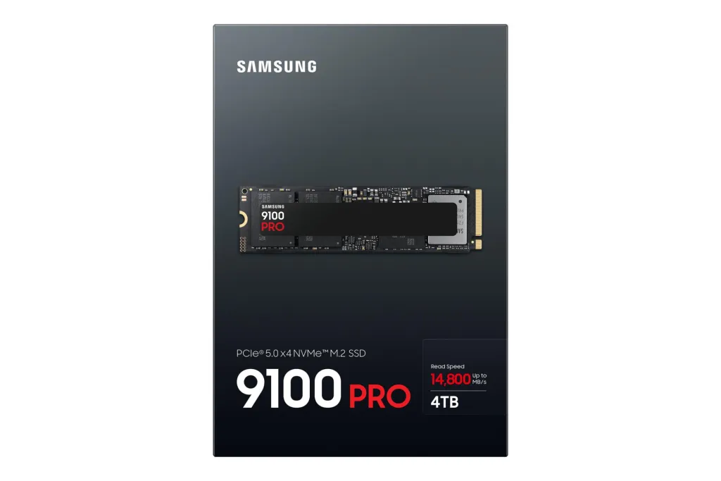 | Summary | Samsung 9100 PRO PCIe® 5.0 NVMe™ M.2 SSD - 4 TB. SSD capacity: 4 TB, SSD form factor: M.2, Read speed: 14800 MB/s, Write speed: 13400 MB/s, Component for: PC/Game console |