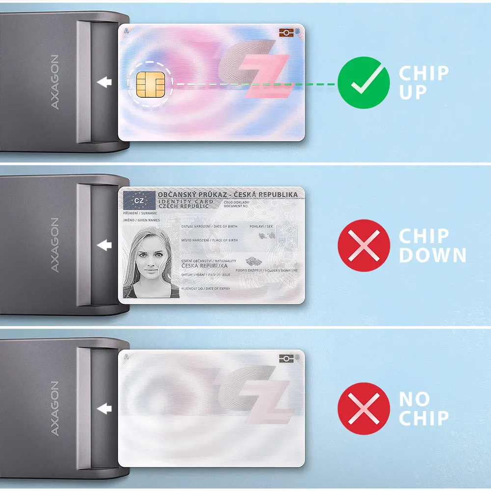 Compact desktop Smart card / ID card reader AXAGON CRE-SM3TC FlatReader with USB 480 Mbps interface. It is especially suitable as an ID card reader for use with mobile phones and computers that have a USB-C input. The reversible USB-C connector simplifies use by eliminating the need to orient the connector correctly when plugging into your phone or laptop.