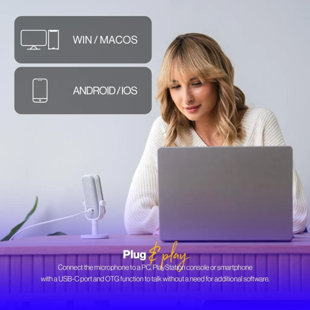 Solum Voice S Onyx White doesn’t need any additional software and works straight away after you plug it in with a convenient USB-C cable. The microphone is also compatible with popular operating systems (including macOS and iOS). Enjoy excellent sound quality whether you're connecting to a PC, PS4 or PS5 console, or a smartphone equipped with USB-C and OTG support.