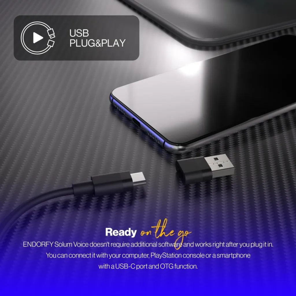 - Plug & play – Solum Voice doesn’t require any software and works just after you plug it in. You can connect it to a PC, PlayStation or a smartphone with a USB-C port and OTG function available.