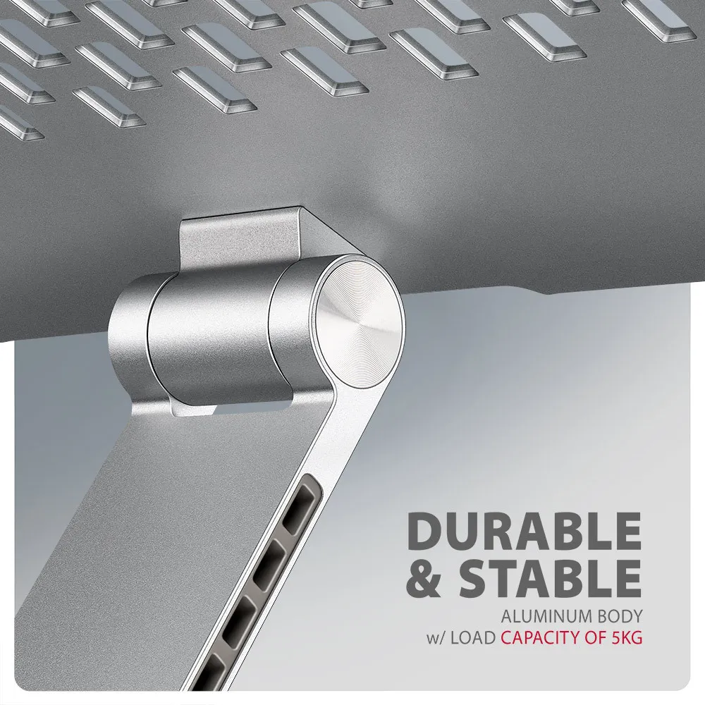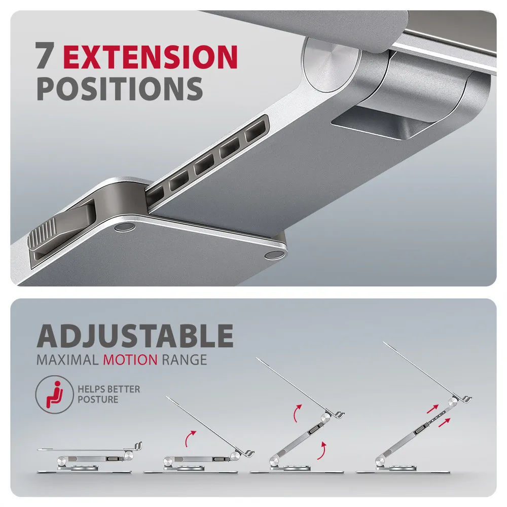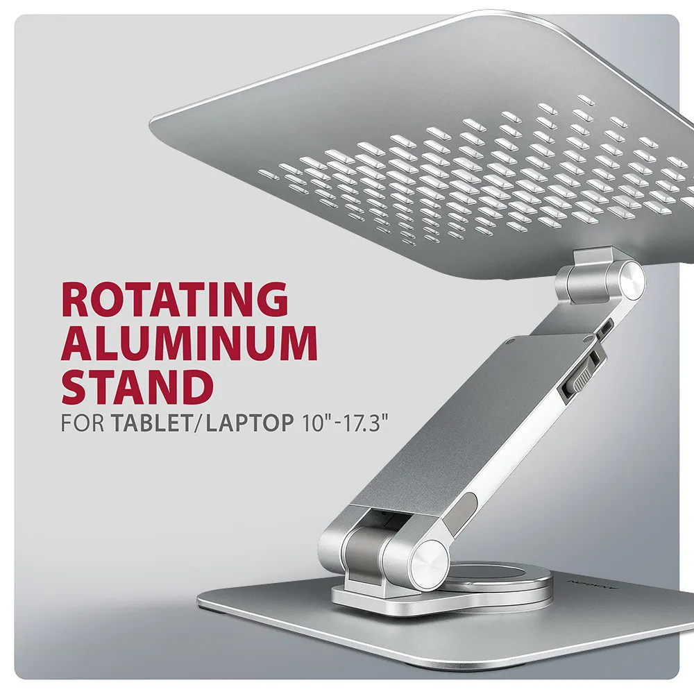 Aluminum stand with 360° rotation for laptops 10" - 17.3". Adjustable height and angle.
