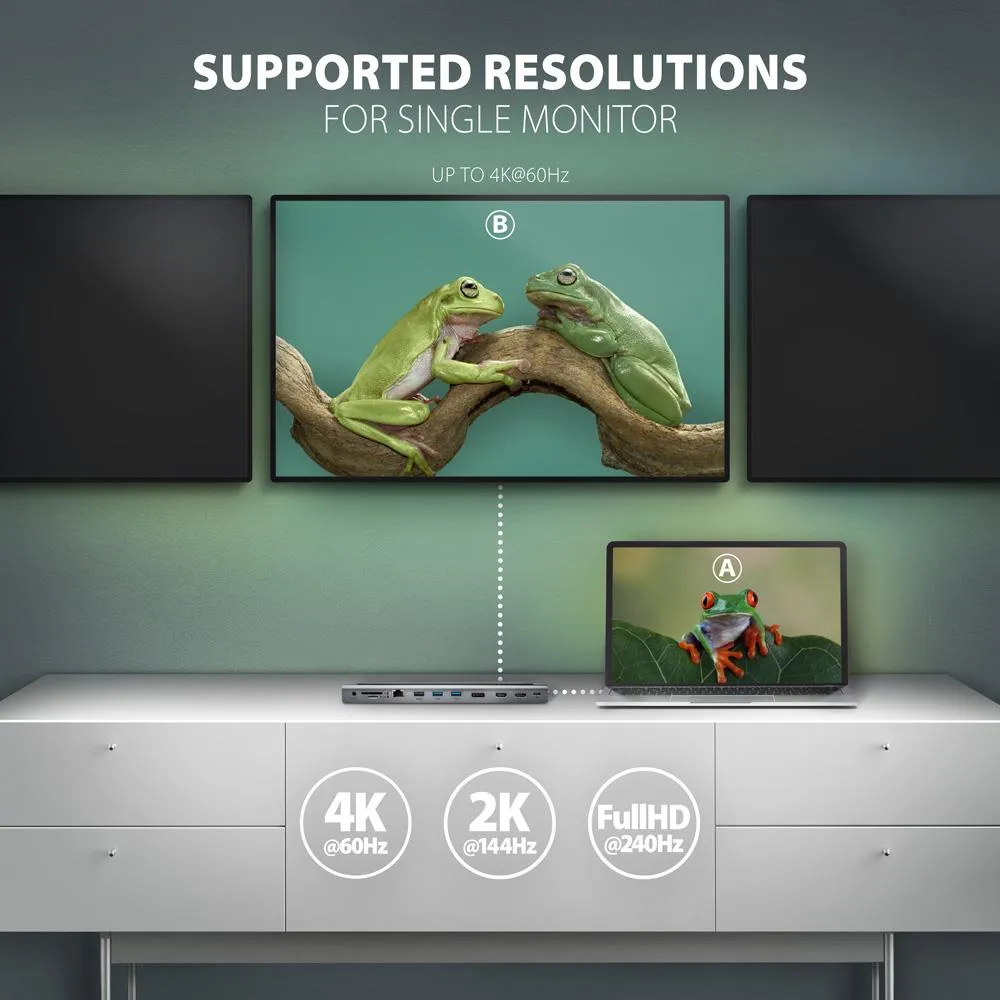 Each of the three video outputs (2x HDMI + 1x DisplayPort) provides a high-quality image up to 4K/60Hz Ultra HD resolution. High frequencies at popular gaming resolutions of 2K/144Hz or FullHD/240Hz are also supported. Even when three monitors are connected at the same time, the docking station can provide a resolution of up to 4K/30Hz on each of them. Thanks to HDR (high dynamic range) support, you can enjoy a significantly expanded range of colors and contrasts without restrictions. DisplayPort Alternate Mode (DP Alt Mode) enabled USB-C port or Thunderbolt 3/4 port is necessary for the proper function of video output. Support for the above max. supported resolutions and frequencies requires connection to a computer with DisplayPort version 1.4.