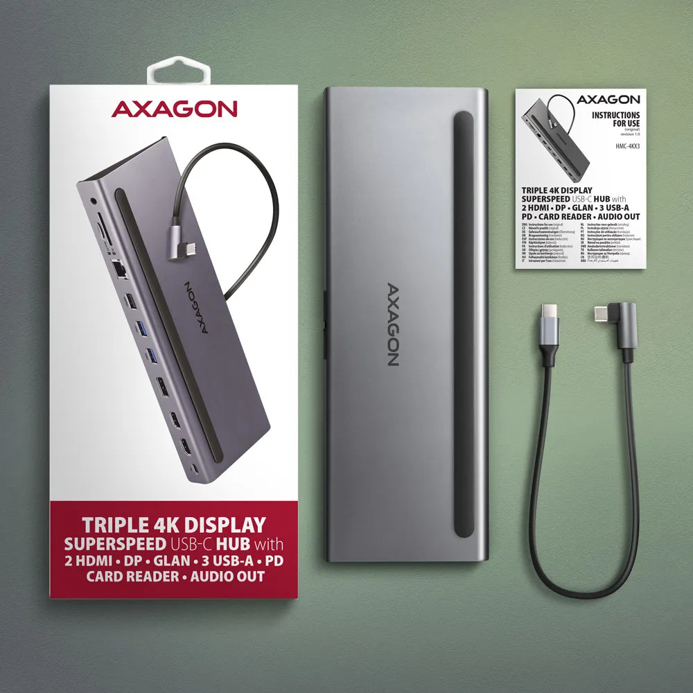 Multiport USB-C 5Gbps TRIPLE 4K DISPLAY hub AXAGON HMC-4KX3 expands your laptop with nine ports and memory card reader SD / microSD. You can easily and quickly connect up to three monitors, three USB devices, a Gigabit Ethernet network, headphones and card reader to your computer at the same time via the double-sided USB-C connector. You also get the possibility to supply laptop using Power Delivery technology at the same time. The USB-C hub will provide you with a universal and powerful 11in1 docking station for modern laptops.