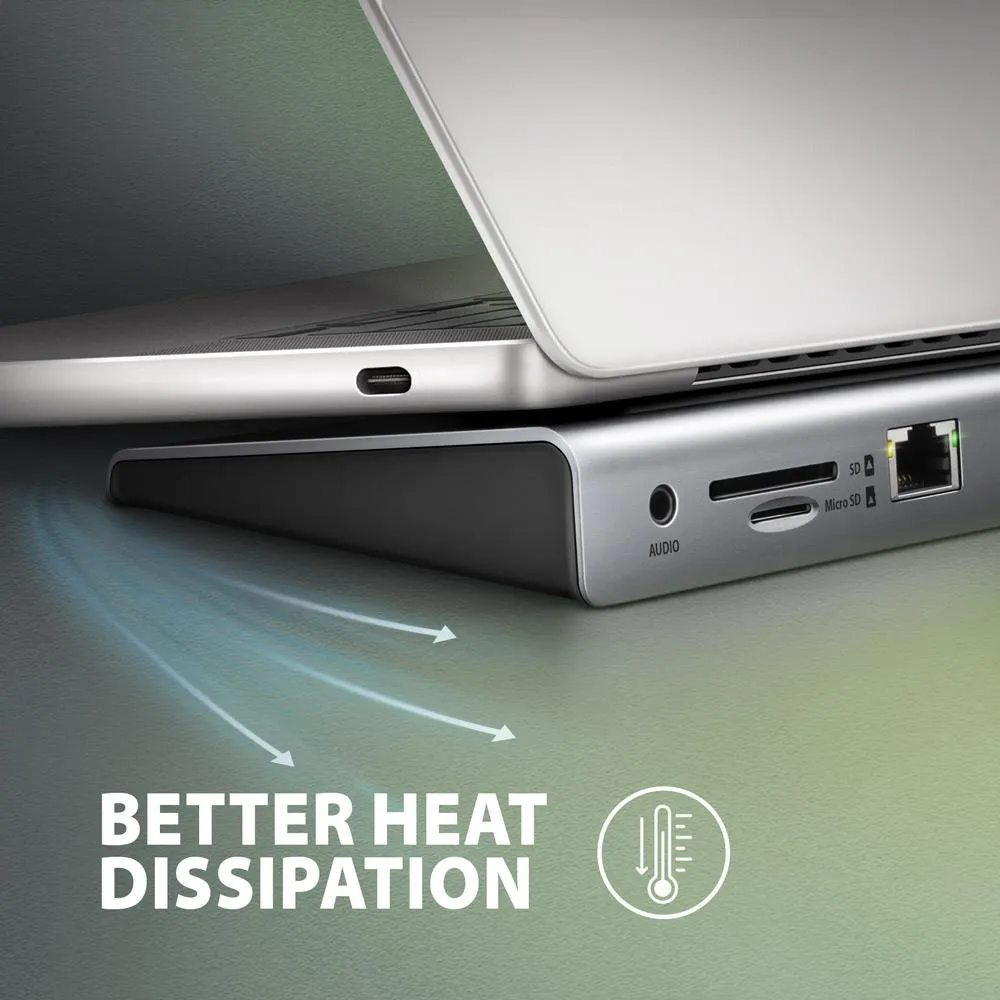 The robust aluminum body ensures mechanical resistance and quality cooling of the docking station. The wedge shape of the hub encourages its use as a laptop pad for better cooling and ergonomic positioning. Also, the included USB-C cable is designed to use the hub as a laptop pad, the optimal length of 40 cm together with the curved connector allows it to be almost entirely hidden under the laptop and contribute to the impression of a clean desk. The USB-C cable is detachable and can be replaced with a longer cable if needed.